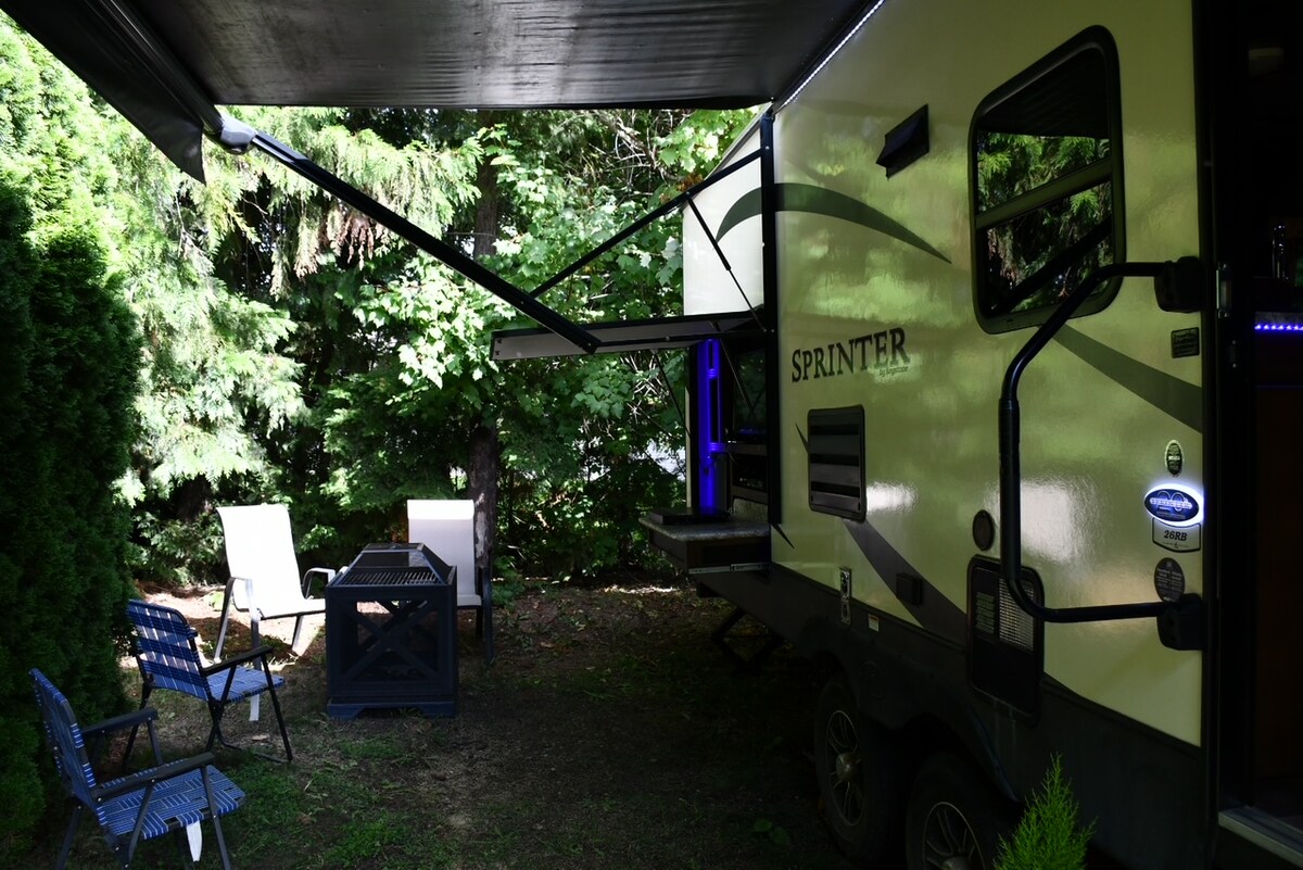 シャスワップ湖RVリゾートにある美しいグランピングサイトで、ドック/水上トランポリンを備えたプライベート400フィートのビーチを楽しんでリラックスしてください。 私たちの27フィートのRVは清潔で手入れが行き届いており、楽しい体験に必要なものがすべて揃っています。 100 mbps (DL )のWi-Fiがあります。 ビーチから徒歩5分、シャワーと遊び場まで徒歩2分です。 10分以内に3つのボートランチがあります(1つは道の向かい側)。 ベッド:クイーン、シングル2段ベッド、ダブルサイズの折りたたみ式。大人4名様まで。