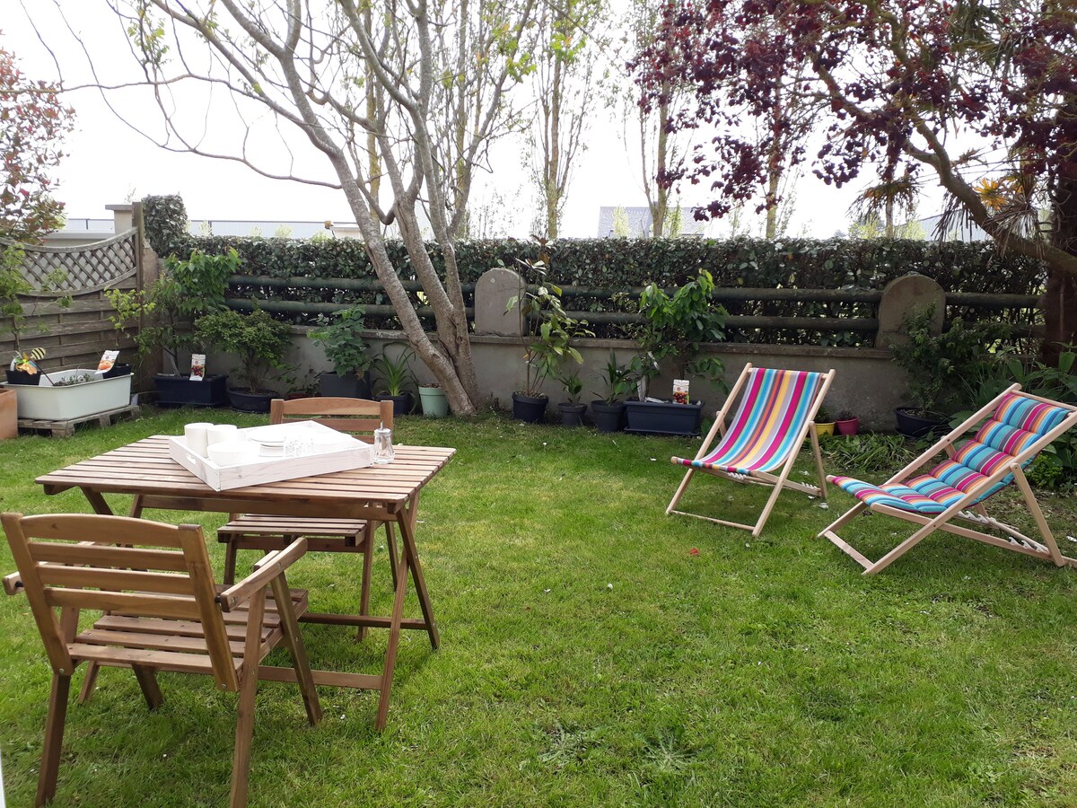 Charmante maisonnette nommée "Ty Gard Thalvis" de 60 m2 avec terrasse, à 200 mètres de la plage, cosy, chaleureuse. Grand séjour avec cuisine équipée, salle à manger,salon avec insert feu de bois,petit bureau,une chambre avec literie de haute qualité et grande salle de douche lumineuse. Vous bénéficiez avec supplément payant des prestations : spa de nage et sauna dans le jardin de votre Maison d' Hôte " Ki Bleiz", Petit déjeuner, Brunch. Box pique nique sur Réservation uniquement.