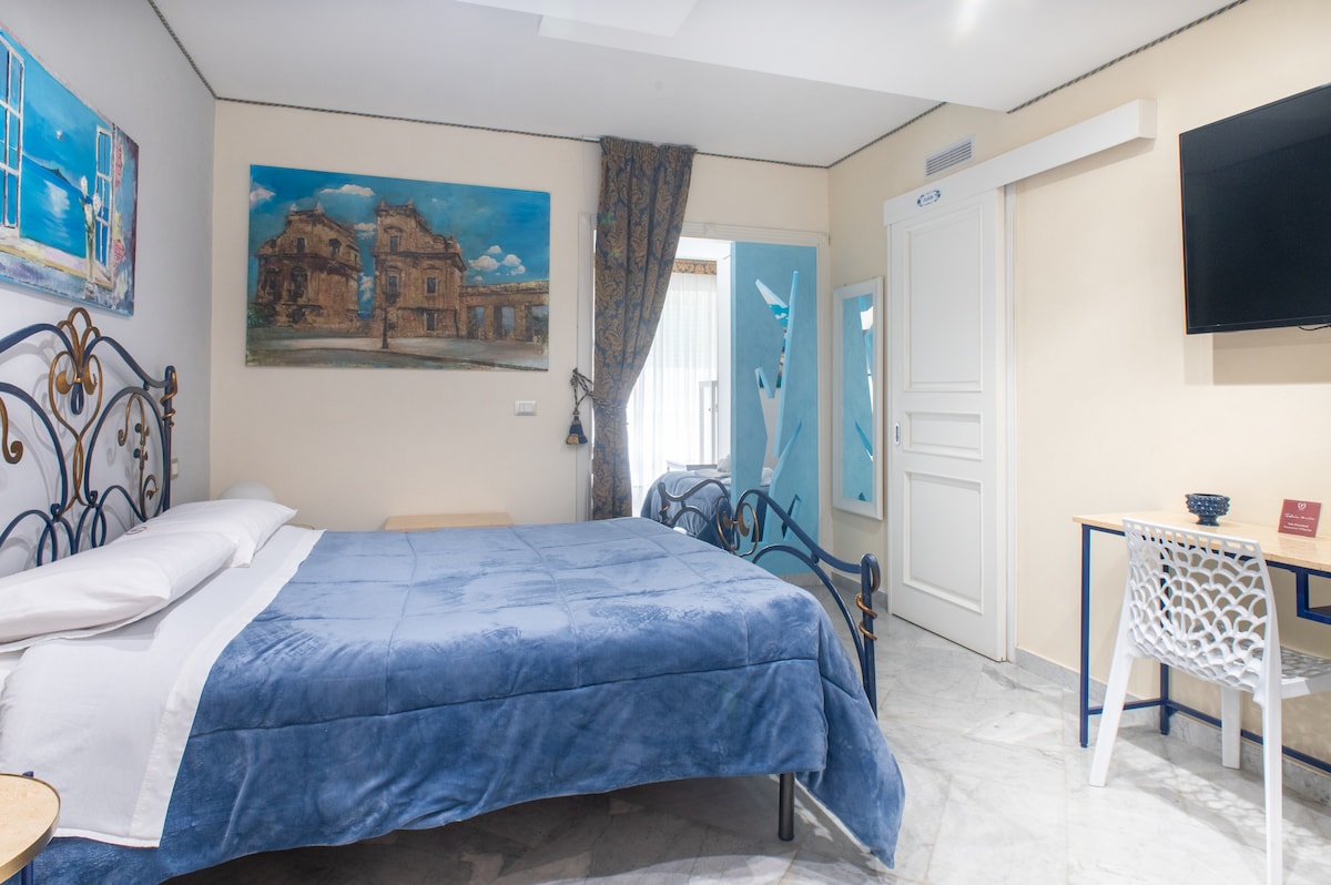 Camera elegantemente arredata con mobili in stile classico e pavimenti piastrellati. La tariffa include la colazione a buffet presso la terrazza panoramica da dove si possono scorgere le Saline di Trapani e Paceco, le Saline di Marsala, parte della costa e del panorama circostante.