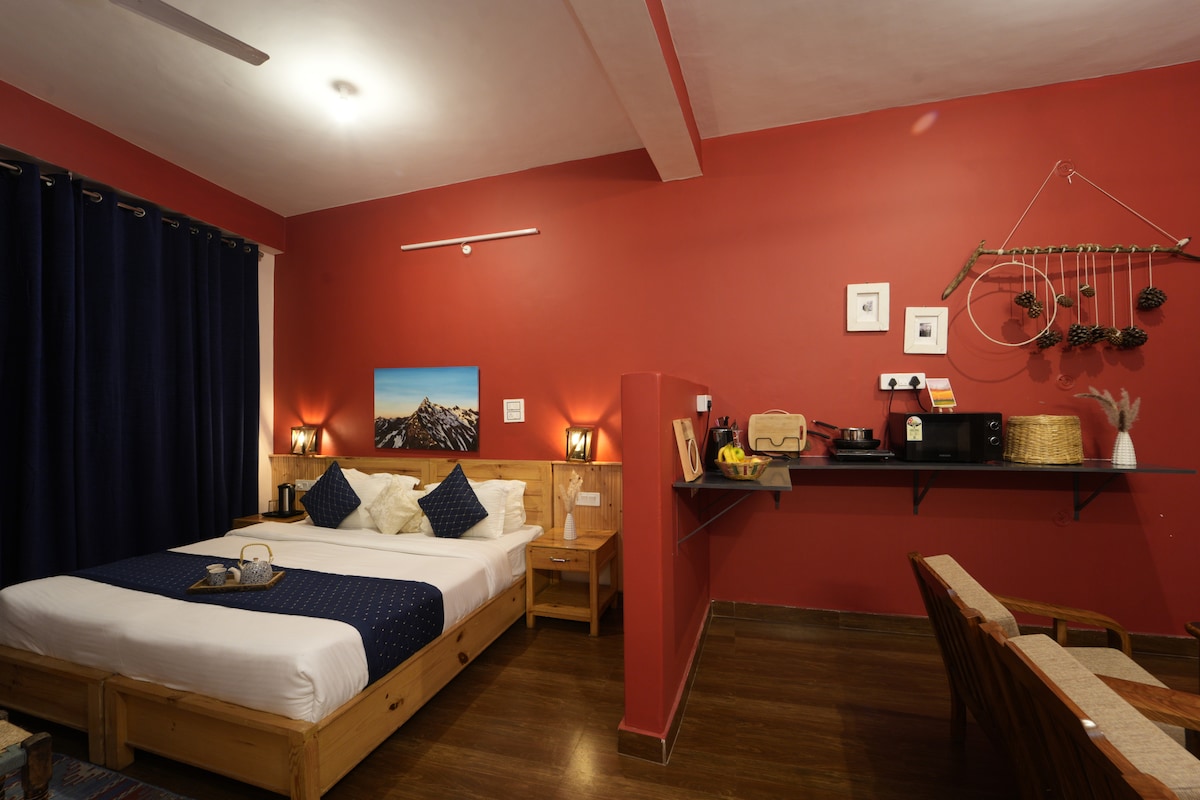エアコン、フルキッチン、洗練された二段ベッド、スマートテレビ、高速Wi-Fiが備わったMountain Vista Studioで快適な豪華さを体験してください。窓から絶景のドーラドハールを眺め、モダンな生活と自然の魅力を融合させましょう。ダラムサラの中心部に位置し、国際クリケットスタジアムHPCAから徒歩ですぐです。交通渋滞や狭い道を避けて、Gharでの平和な都市の逃避が待っています。