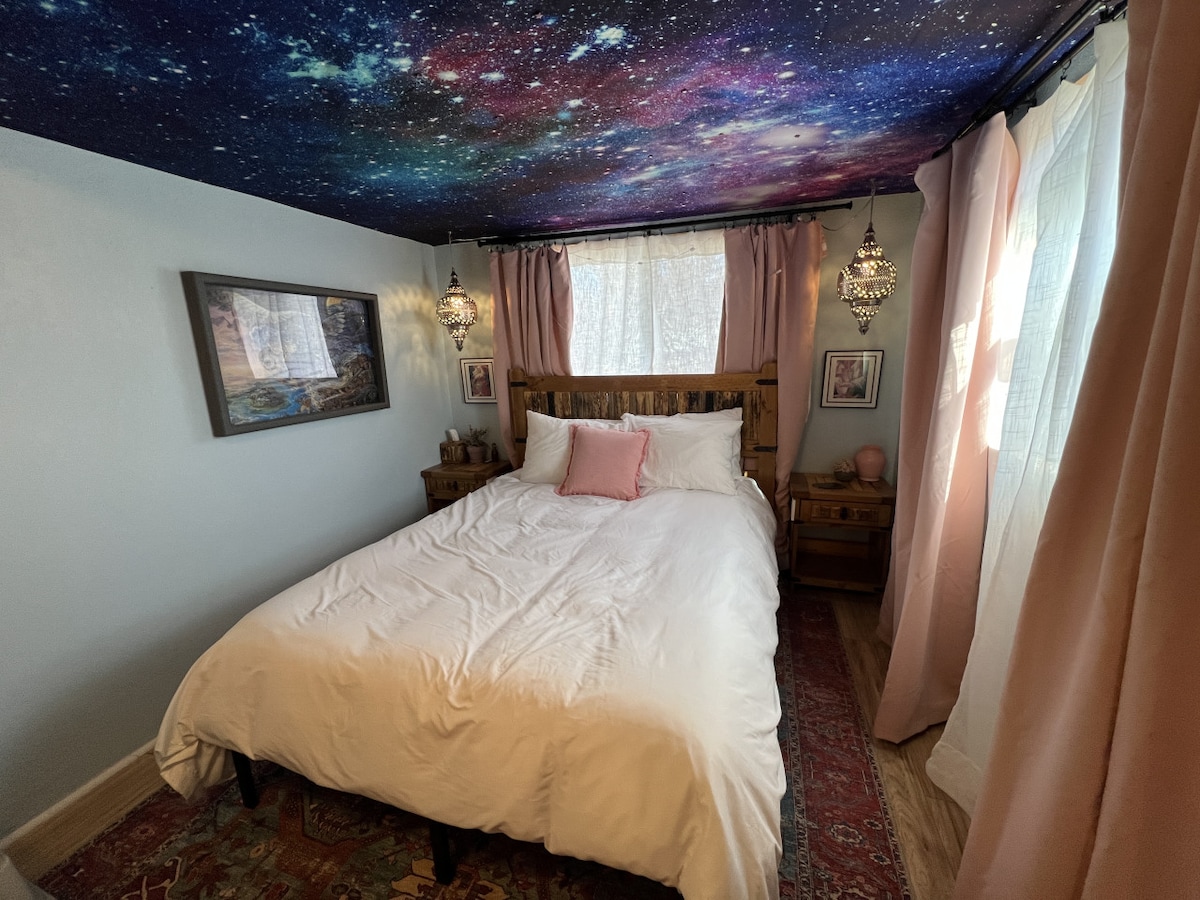 The Sundancer Dream Wagon features tarot-inspired curtained sleeping cubbies with 3 single beds (RV Twin sized) plus a queen, perfect for groups. Private bathroom with shower, kitchenette (Nespresso, French press, tea bar, fridge, microwave, sink), and access to natural hot springs. A stunning curved copper ceiling with gold and turquoise tones along with magical touches create a retreat that's whimsical and comfortable. Very close to the Riverfront Rotary Park and healing waters trailhead.