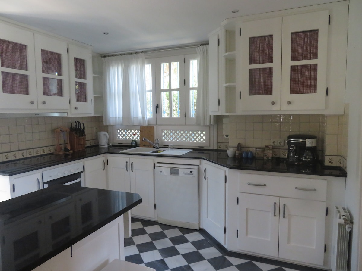 マルベーリャの最高のロケーションにある美しいヴィラ:プエルトバヌスとその美しいビーチまで車で4分または徒歩で20分、大型スーパーマーケットのメルカドナと多くのレストランやパブから100メートル、バス停の隣にあります。 プライベートで静かで、庭とプールがあり、周囲の山々の景色が素敵です。 上品に装飾され、必要なアメニティがすべてそろっており、ご家族やご友人のグループに最適です。 ソファベッドがあるので、必要に応じて9人目の方が宿泊できます。