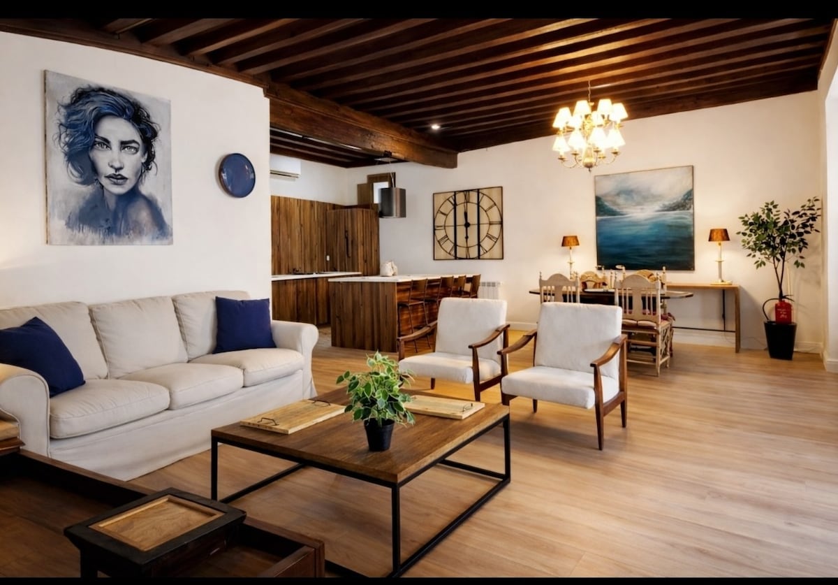Elegante apartamento 108 m² en Edificio Histórico en el centro. Techos artesonados y balcones. PARKING GRATIS: Vigilado 24h, acceso por lectura de matrícula y carga eléctrica. ESPACIO ÚNICO: Une tradición y modernidad. 2 habitaciones (principal en suite), 2 baños, despacho, salón, comedor y cocina con isla. CONFORT: AC, Calefacción, WiFi, Cerradura inteligente sin llaves y detector Humo/CO. Obras de arte y sábanas de hilo. Ideal para visitar Ávila a pie y conocer pueblos o ciudades cercanas.