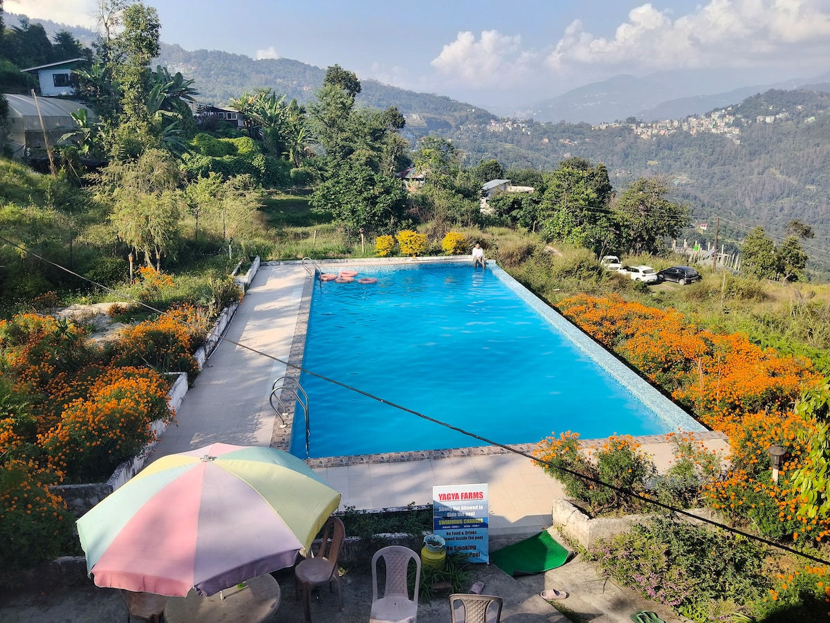 Nestled in the serene Himalayan mountains of West Sikkim, just 2 hours away from Darjeeling, Cloudsong @ Thangsing Farmhouse offers an unparalleled experience of peace, tranquillity, and immersion in nature. As you step onto the farm, youll be greeted by the harmonious sounds of various birds chirping, the gentle lowing of cattle, and the melodic hum of crickets lingering in the air.