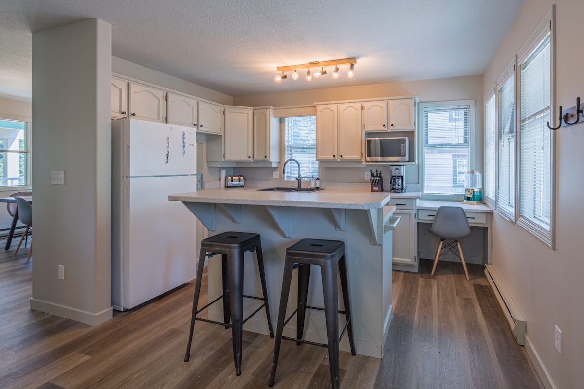 明るい3ベッドルーム、1バスルーム、ベッド8台、最大10名様まで宿泊可能です。 2組のご家族に最適です。 階段のない1階の完全なコンドミニアム。ガス調理器具 テレビ、DVD、無制限Wi-Fi、屋根付きジャグジー(年中利用可能)とガスバーベキュー付きの専用デッキ。 シルバークイーンとシルバーウッズのリフトの間に位置する素晴らしいロケーションで、スキーイン・スキーアウトができ、チューブタウン、ブリューワーズポンド、または村まで徒歩ですぐです。 子どもが遊べる共用の屋外エリア 車道に無料駐車場2台分完備。 敷地内に無料ランドリーがあります。