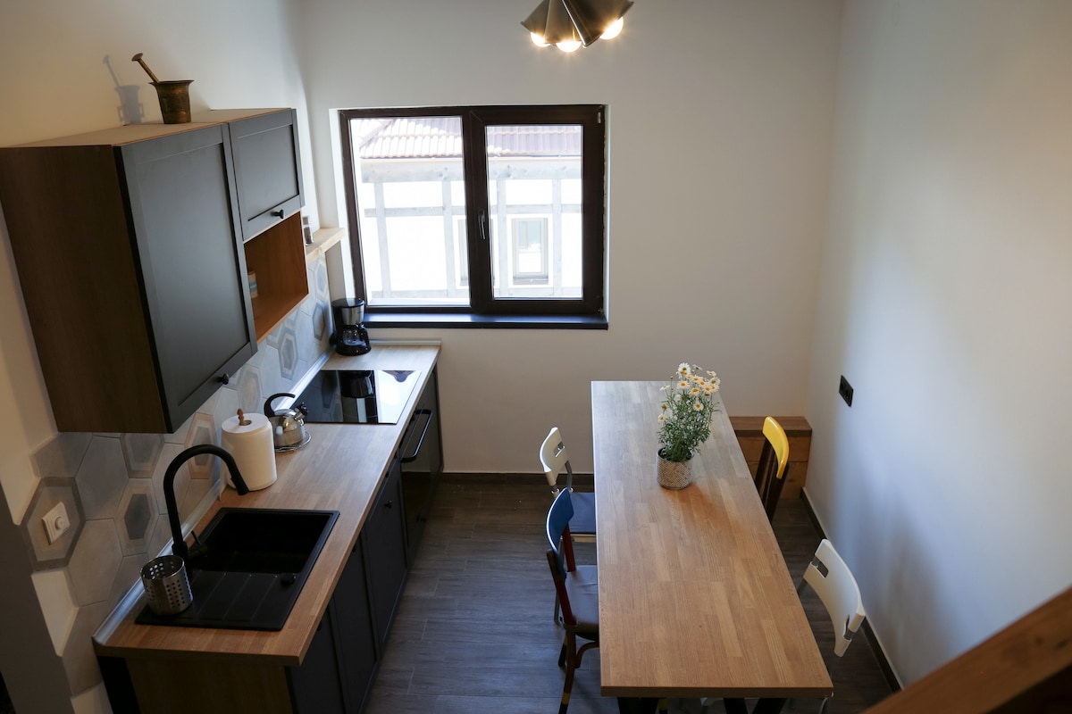 シナイアの象徴的なペレシュ城の近くにある、快適な1ベッドルームアパート、ペレシュ城ブティックアパートへようこそ。この素敵な家は、スタイリッシュなデザインとモダンな生活の快適さをすべて兼ね備えています。中に入ると、設備の整ったキッチンと快適な滞在に必要なすべてのアメニティ・設備が揃っています。冒険好きの旅行者でも、ちょっとした逃避行を求めている方でも、このユニークな空間は最大4名様まで宿泊可能で、周囲の自然の美しさを楽しむことができます。