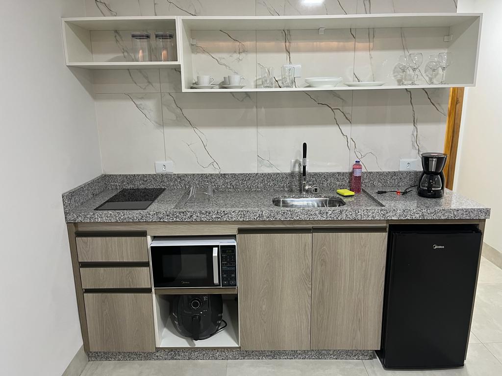 Apartamento com cama de casal, ambiente limpo e seguro, com quarto que possui lençóis de ótima qualidade, cobertores macios, cozinha com área de alimentação e trabalho, com louças disponíveis, microondas, chaleira elétrica, frigobar e de brinde pó de café para o preparo de seu cafezinho e no banheiro tem sabonete líquido, shampoo e toalhas branquinhas.
