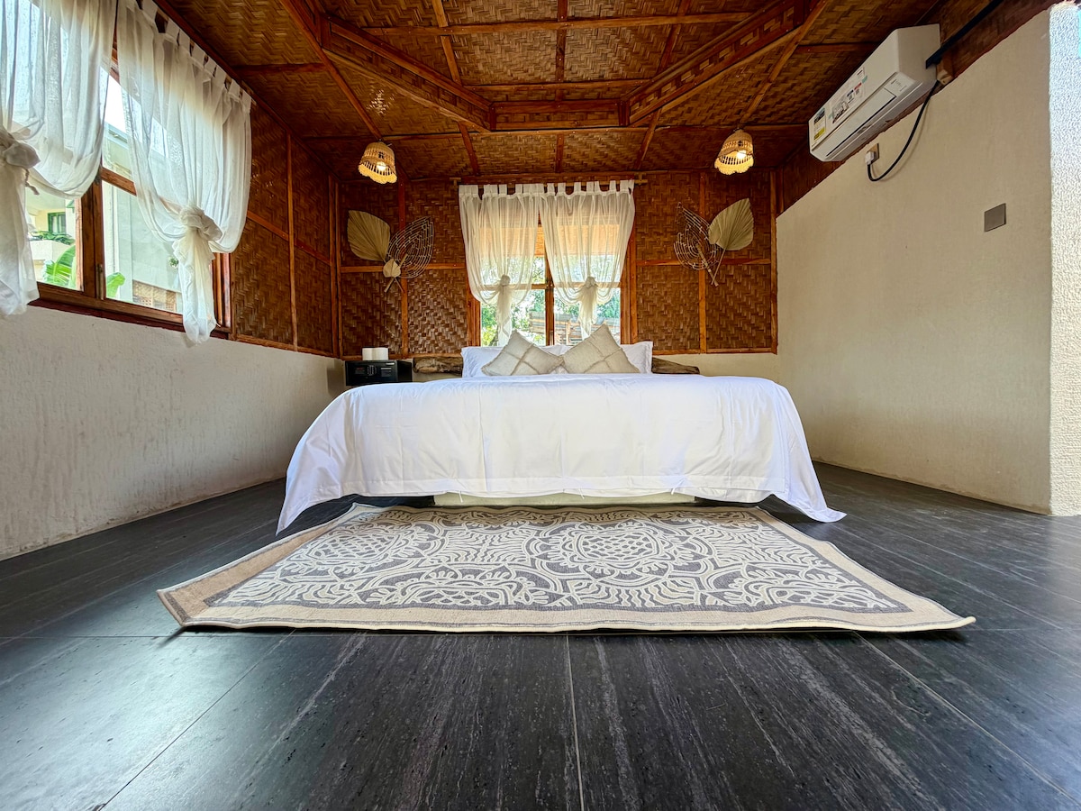 Room 105 is an independent cabin beside the pool, offering more privacy than our other units. Its ceiling and wall panels use traditional local comba, keeping the interior naturally airy and comfortable. A semi-open kitchen with a dining and lounge area extends the living space and creates an relaxed indoor–outdoor atmosphere. The tropical open-air bathroom enhances the island experience. Starlink Wi-Fi, solar power, and a naturally filtered pool are available.
