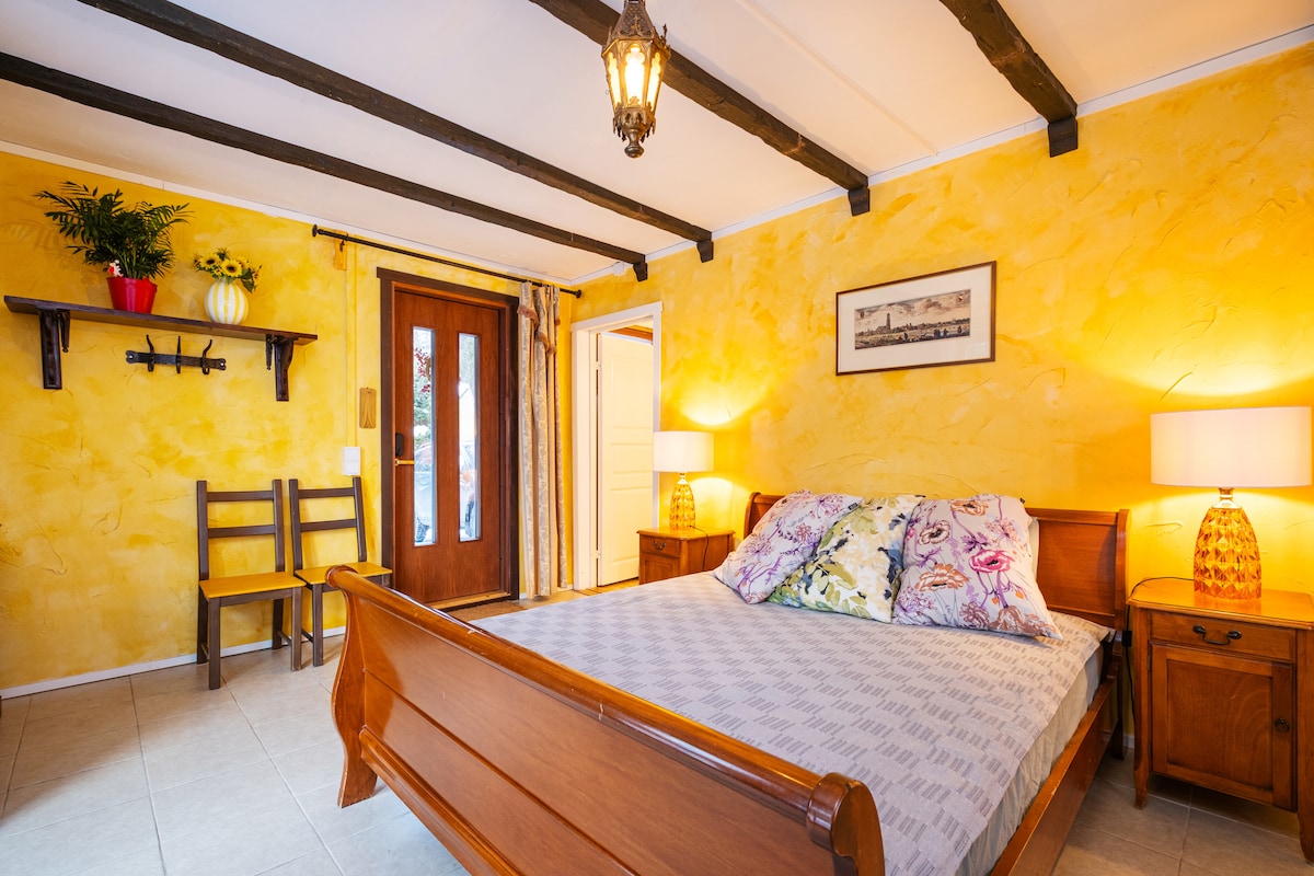 日当たりの良い庭と泳げる池がある居心地の良いコテージ