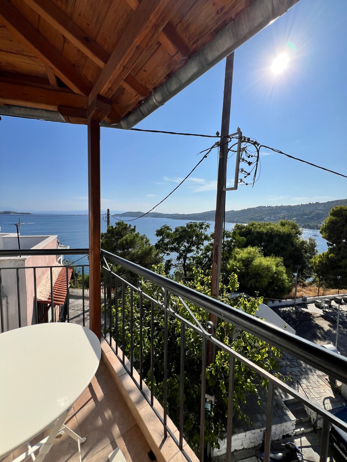 A three floor newly build house overlooking the port. Located centrally but in a quiet neighbourhood ,only a two minute walk to the main street and port of Skiathos. Amazing sunrise views, gaze the sailing boats set sail, listen to the sound of the masts when windy and watch the aeroplanes come in to land. Balconies on every floor.