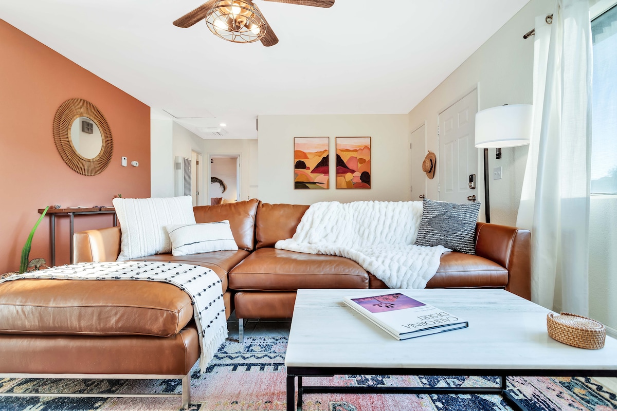This colorful, contemporary 2BR/2BA lower-level condo is your perfect Palm Desert retreat 🌴 Steps from a sparkling pool + hot tub, the space is fully furnished with everything you need to relax and recharge. Enjoy sunset mountain views from the back patio, gathered around the fire pit in your own private, lush oasis 🔥⛰️ We love furry friends 🐾 A $100 non-refundable pet fee is added at booking. A Pack ’n Play + high chair are also available for little ones.