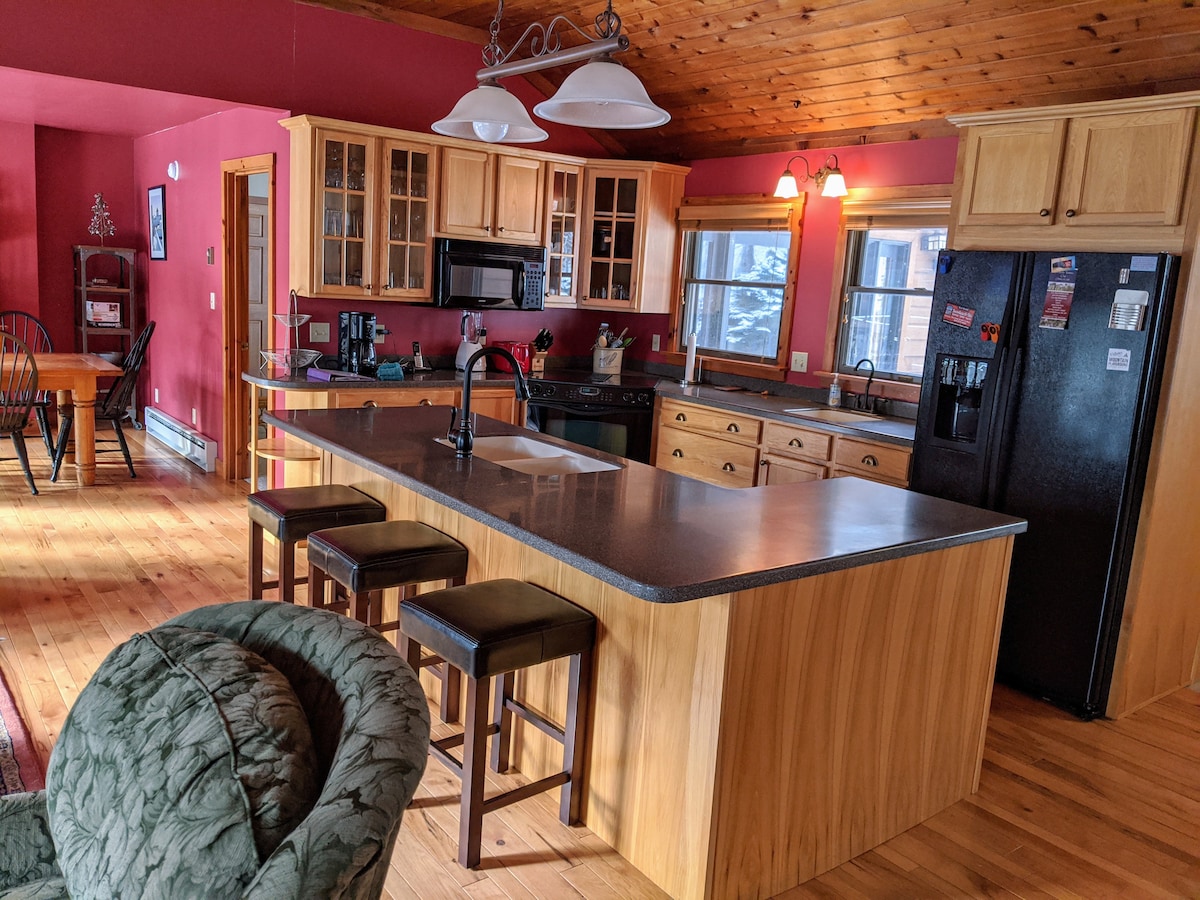 Snowshoe Chaletは、季節を問わず山の旅にぴったりの宿泊施設です。素晴らしい景色、超高速Wi-Fi、そして誰もが使えるお部屋を備えた、居心地の良いプライベートな空間です。 5つの寝室、4つのフルバスルーム、シャッフルボード、パックマン、フーズボールを備えた専用ゲームルーム。日の出のコーヒーや夕暮れどきのドリンクを楽しめる3つのデッキ。スキー、スノーボード(必要な場合)、ハイキング、カヤック、チューブ、またはファイヤーピットのそばで星を眺めることもできます。 大きなキッチン、グリル、リネン、タオルが含まれています。リラックスして、探索して、再びつながり、素晴らしい思い出を作りましょう。