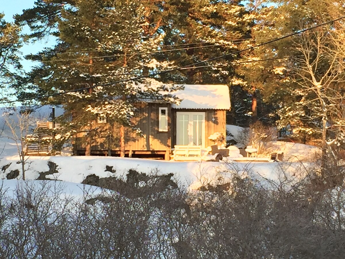 Nybyggd stuga på 30 kvm. 5 minuters promenad från hamnen. - Öppen planlösning med kök och vardagsrum i ett. - Sovloft med 2 enkelsängar. - Vardagsrummet har en Bäddsoffa. - Köket har induktionshäll och ugn. - Helkaklat badrum med toalett, dusch och tvättmaskin. - Stor altan runt huset med matplats. - Utsikten består av tall och blåbärsskog - Städning ingår ej. - Husdjur ej tillåtet - Gäster har med sig egna sängkläder och handdukar (kan hyras för 150 kr per person)