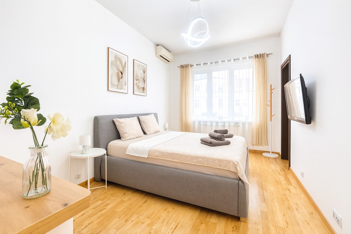 B(11) Smart & Modern Apartment welcomes you right in the heart of Sofia! Just steps away from the best-known tourist attractions and great places to be! We personally designed and implemented every single detail of this naturally bright corner suite, so you can feel here like at home. Relax and enjoy our comfortable bed, deluxe amenities and best selection of coffee&tea. Safe underground parking slot is at your exclusive disposal. Easy-going self check-in and check-out for a hassle-free stay.