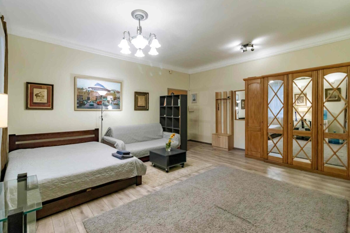 ð¿ Tranquil, spacious 48 m² designer studio in leafy Lypky â Kyivâs historic heart. ðïž Prestigious government district â secure and well-protected area. â¡ Reliable 24/7 electricity with no outages. âïžð¥ Warm year-round: Cooper&Hunter AC (â25°C to +50°C) + heated bathroom floors. â Fully equipped kitchen & drinking water cooler. 𧺠Washing machine + separate dryer. ð Easy self check-in anytime.