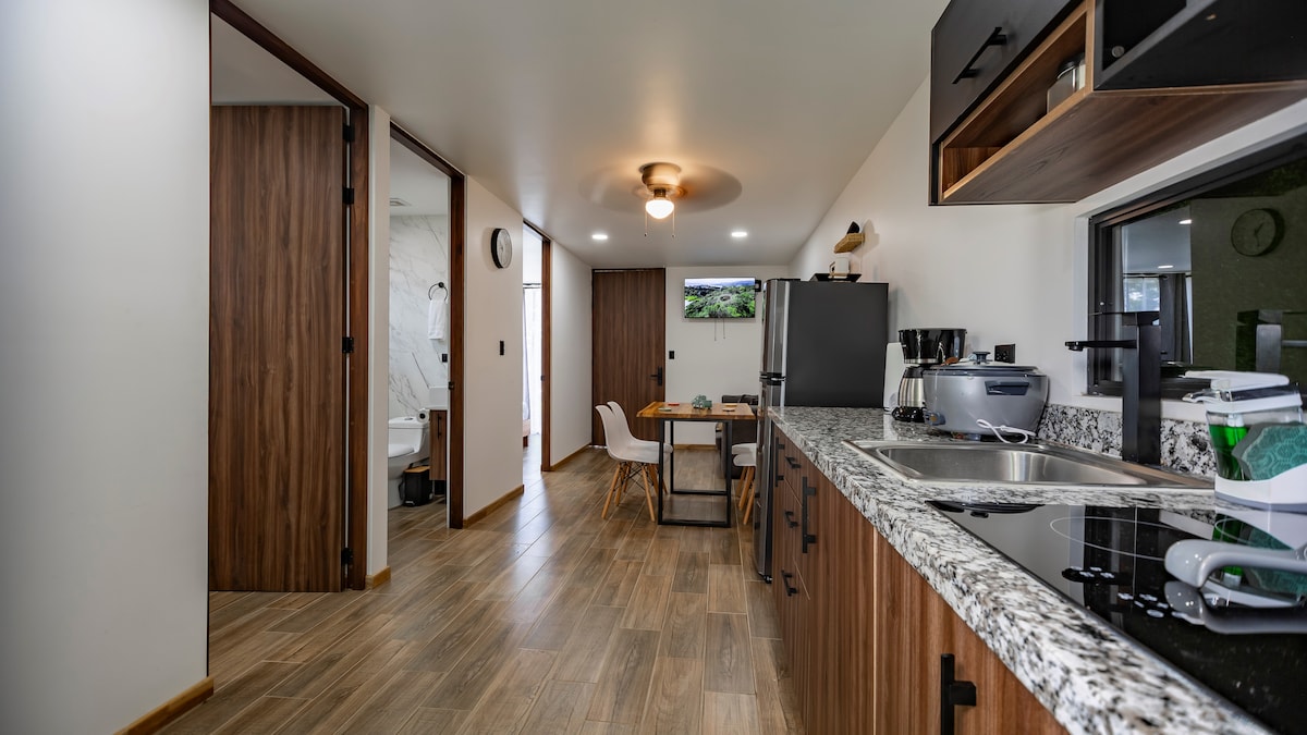 Escape to your own tropical hideaway in the heart of La Fortuna! 🌋 🌴✨ This stylish villa offers a king bed, jacuzzi, private outdoor shower, and a lush rainforest terrace just for you. Stay connected with ultra-fast WiFi, relax with a 55” Smart TV, and enjoy full comfort with A/C, hot water, kitchen, and private parking. Designed for couples or adventurers seeking luxury, privacy, and an unforgettable connection with nature.