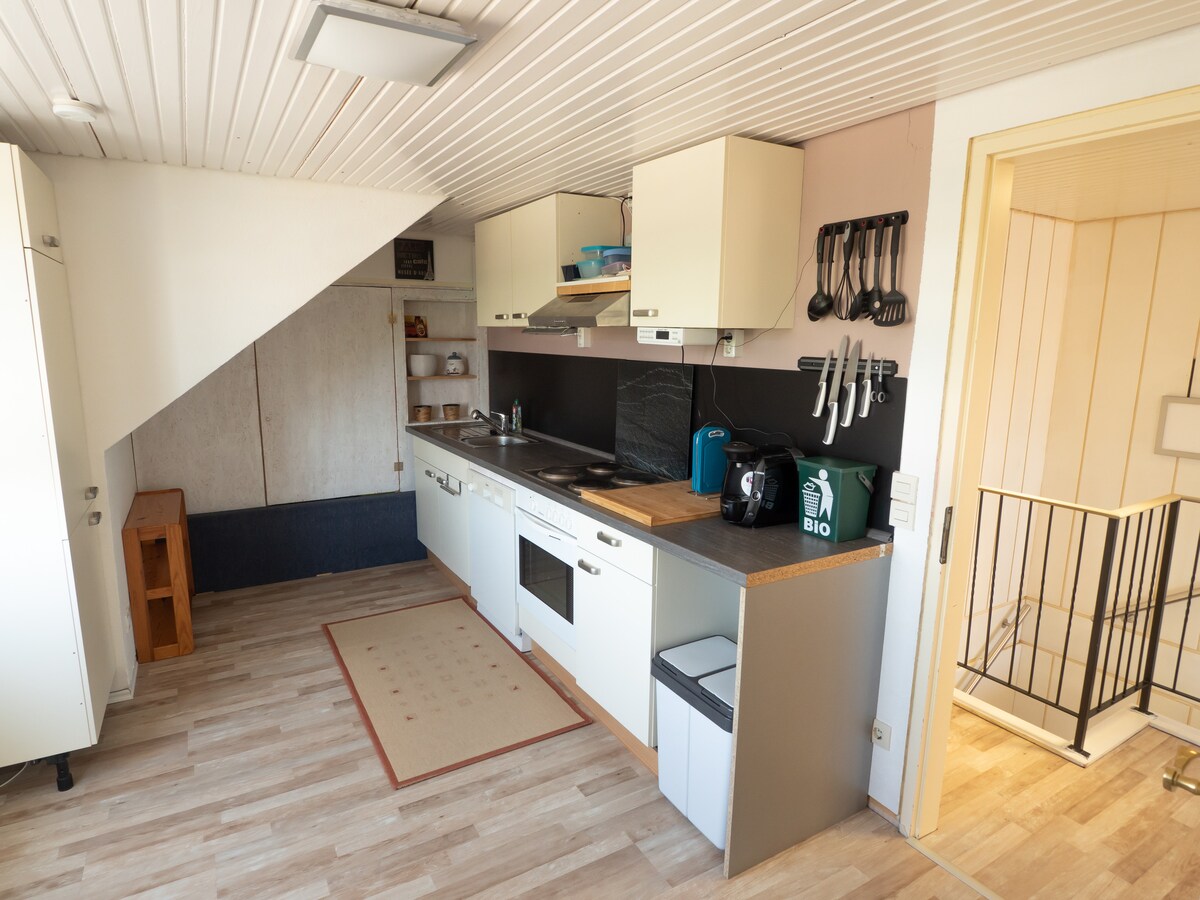 Unsere kleine gemütliche Ferienwohnung liegt direkt an unserem Wohnhaus mitten auf dem ersten Deich. Ihr habt eine kleine Wohnküche, ein Schlafzimmer mit TV, Bluray-Player und Schreibtisch. Im Erdgeschoss befindet sich auch das kleine Badezimmer. Eine Treppe hinauf ist ein weiteres kleines Schlafzimmer mit 2 Matratzenbetten auf Europaletten.