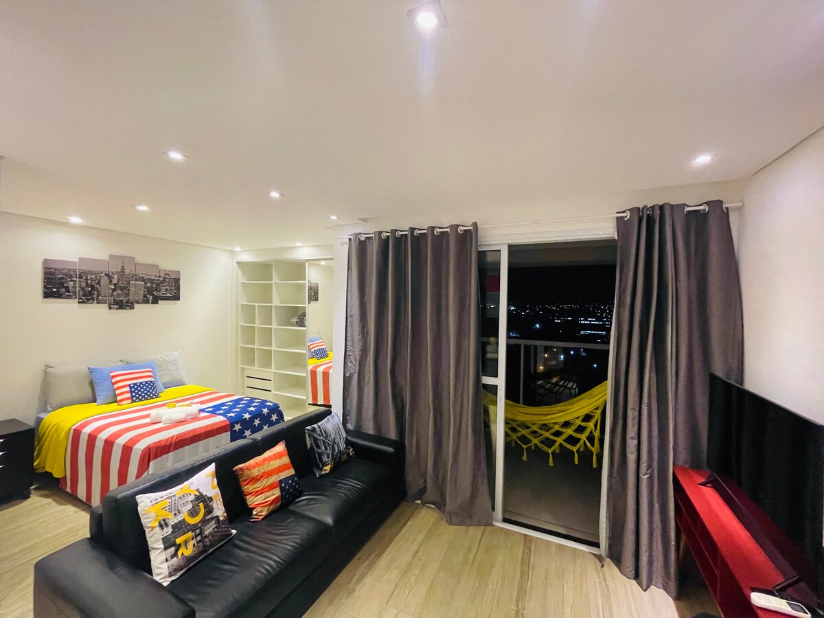 エレガンスを失うことなく、快適さと利便性を好みますか? あなたの居場所はここです。 ニューヨークをテーマにした装飾、ワンルームマンション 独自のスタイルを持っています。 必要なものがすべて揃っていますが、目障りなものは一切ありません。 11階に位置し、街の地平線を一望できます。 建物には2つのエレベーターと24時間ドアマンがいます。 屋根付き駐車場もあります。