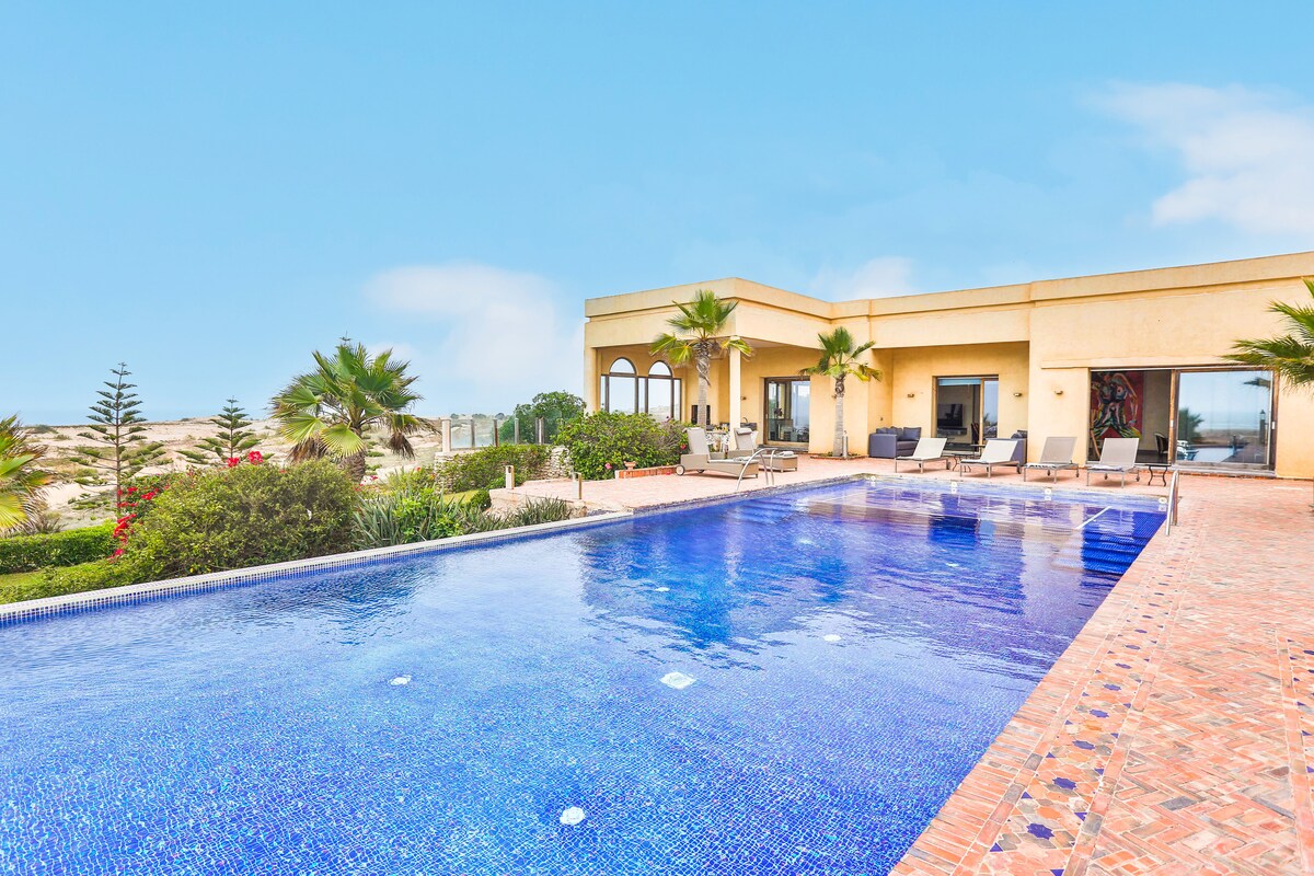 ヴィラ・クラッセ・プルミエール 5つ星のコメント202件 3つのサイトにて エッサウィラからわずか6キロ 160平方メートルのヴィラ 完全貸切 1階 隣家に面していません しかし、孤立していません シックな装飾 建築家のヴィラ モロッコの伝統と洗練されたデザインの間 最高の快適さ 4GWiFi シモンズ製ベッド3台 3バスルーム プールと庭の景色を望む広々としたリビングルーム 暖炉 サムスン製大型HDテレビ ジェットバス付きキッチン バーベキュー オプションでBOUCHRAによるお食事の配達