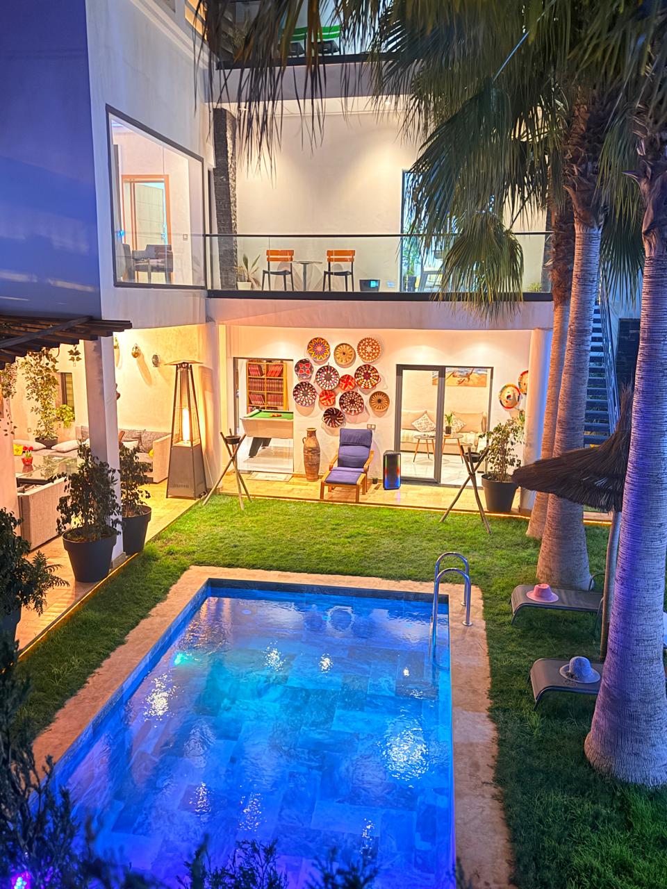 Welcome to Agadir Bay 🌴! Enjoy a spacious ground-floor apartment designed for families, friends, or remote workers. Just 5 minutes from the beach 🏖️ and surrounded by restaurants, cafés, and takeaways 🍣🍔. ✨ Highlights: Bright living room + 3 bedrooms (including a master suite) 2 bathrooms + fully equipped kitchen 2 private outdoor spaces: a poolside terrace 🏊 with dining area & swing, plus a garden with lounge seating & BBQ 🍖 Smart TVs in every bedroom with IPTV 📺 Baby essentials 👶