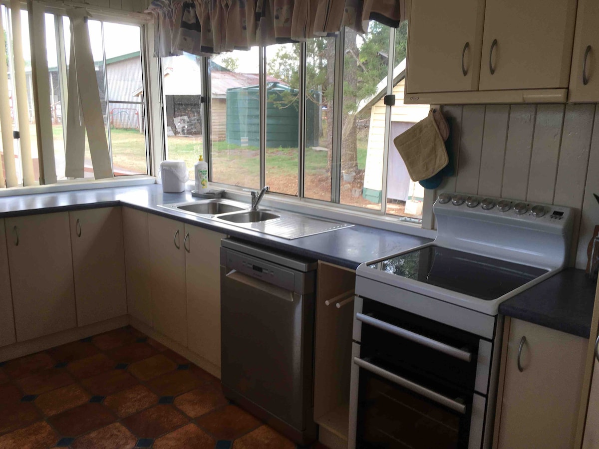 A country getaway on 5 acres. A neat little cottage with 2 bedrooms, and a 3rd bedroom/granny flat detached from main house on 5 acres. Close to town (6km) in the South Burnett region, with easy getaways to cycle trails, state forest, local sights with lots of local food and delicacies. NOTE: We have had request for families with infants. There is unfenced dam on the property, and we have been advised not the take bookings with infants. No work bookings please, as we have had bad experiences.