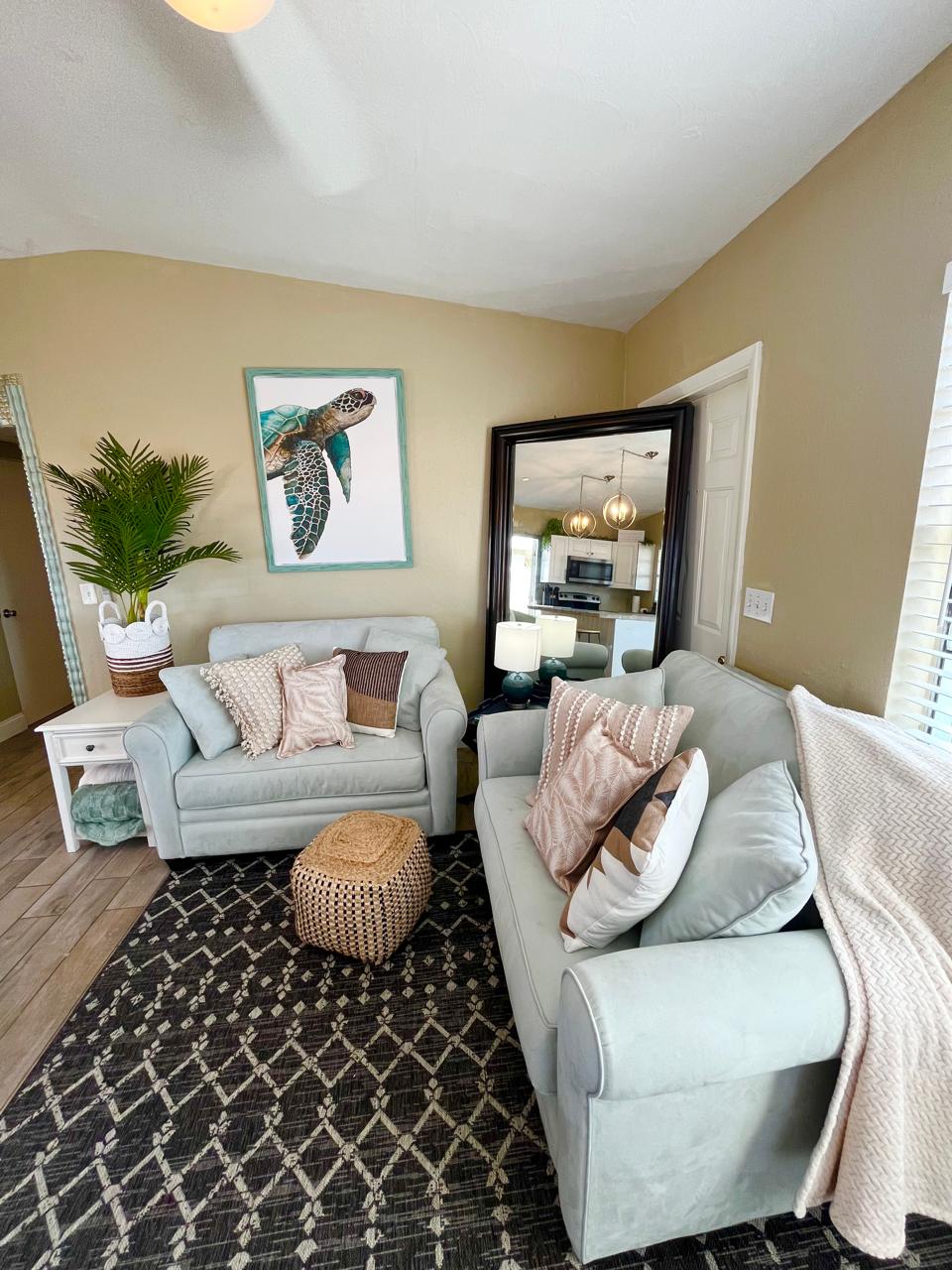 快適なベッド2台、バスルーム2室、キッチン、リビング、ダイニングのコンボで、おくつろぎいただけるように意図的に設計されています。 カリフォルニアキングベッドルーム1室とクイーンベッドルーム1室、高級マットレスと寝具付き。 全室に4Kテレビ、高速インターネット。 スクリーン付きのポーチでリラックスしたり、玄関先のポーチでモーニングコーヒーをお楽しみください。 改装済みの設備の整ったキッチン。安全な横断歩道がある公共ビーチまで徒歩12 ~15分(車で4分、駐車も簡単)、ケネディ宇宙センターまで30分、オーランドとテーマパークまで60分