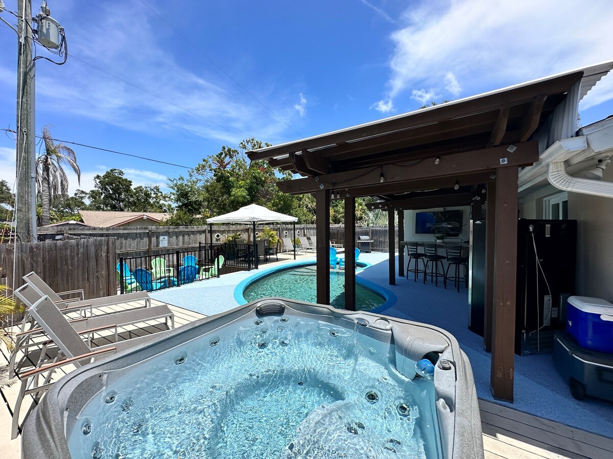 THE PALMS is a single-family home with heated private pool in the heart of Sarasota. The home is 5 miles to the #1 beach in the USA: Siesta Key Beach. It offers 3 bedrooms, 2 bathrooms, a large living space & screened-in sunroom. The fully private, fully enclosed outdoor space is one-of-a-kind with a heated pool, hot tub, BBQ grill, fire pit, beach bar, outdoor TV & lounge chairs for families & snowbirds to enjoy Florida living in style!