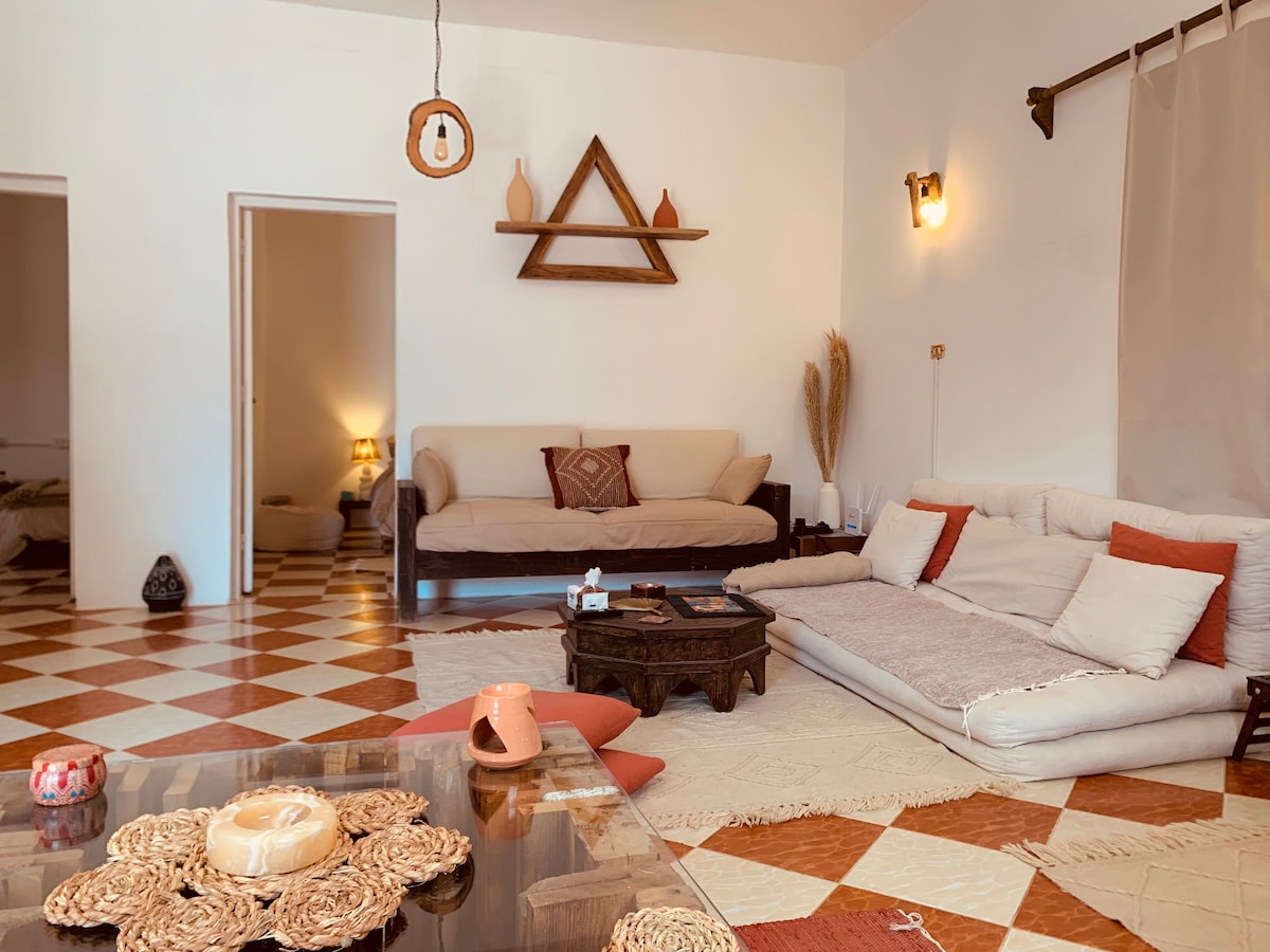 ダハブの快適な我が家へようこそ! 1階に位置する「Sea-through」アパートメントからは、写真の通り、ヤシの枝と太陽光線を通して美しい海の景色を眺めることができます。 この広々とした1ベッドルームのアパートには、ダハブで愛されているオーガニックで自然なライフスタイルを反映した手作りの家具やアクセサリーがたくさんあります。 ビーチのすぐそばの2列目に位置し、アサラ市場まで徒歩わずか3分、灯台まで徒歩10分です。