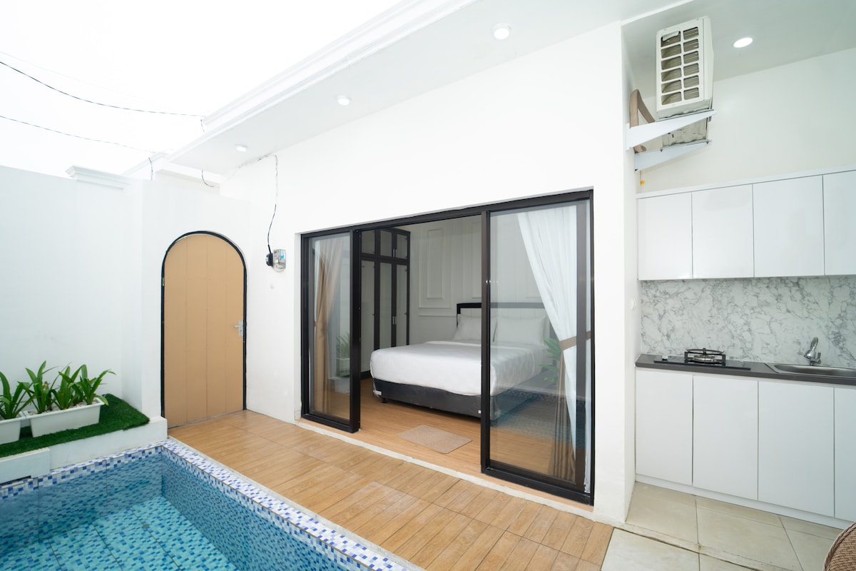 ジョグジャカルタで最高のお値段! 街のすぐ北12 kmのNgaglikにある快適なヴィラ。 快適なプライベートプールと静かな雰囲気を備えた1KTヴィラ。素晴らしい地元のレストランがたくさんあるエリアにあります。リラックスした滞在に最適です。 専用プール、調理器具付きミニキッチン、テレビ、バスルーム、キングサイズベッドを備えています。