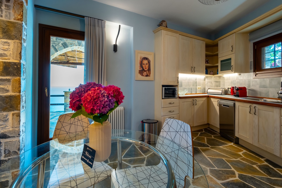 A country stone house gives you the opportunity of privacy and relaxation. Surrounded by olive trees and a breathtaking view of Aegean sea. Petit Stonehouse is five minutes drive from Mulopotanos Beach and five mins from Tsagarada village. Also available BBQ-Air cooler - fireplace-Tv-Hot water