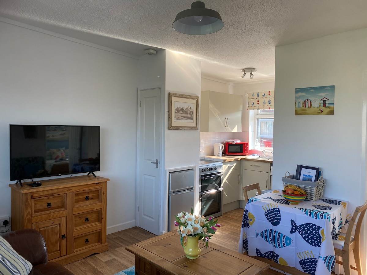 清潔でモダン、ビーチのような雰囲気のコンパクトで居心地の良いシャレーです。 2021年初頭に全面改装され、ダブルオーブン、内蔵電子レンジ、新しい電気シャワーを備えたモダンなバスルームを備えたキッチンが完備されています。 全体に新しいフローリングが敷かれ、配線と塗装が一新されました。休暇や短期休暇のためにお迎えする準備ができています! ダブルベッドルームと二段ベッドルームがあり、海辺の家族旅行に最適です。 道を渡って崖の道を下ってビーチまで行けば、近くにお店があります。