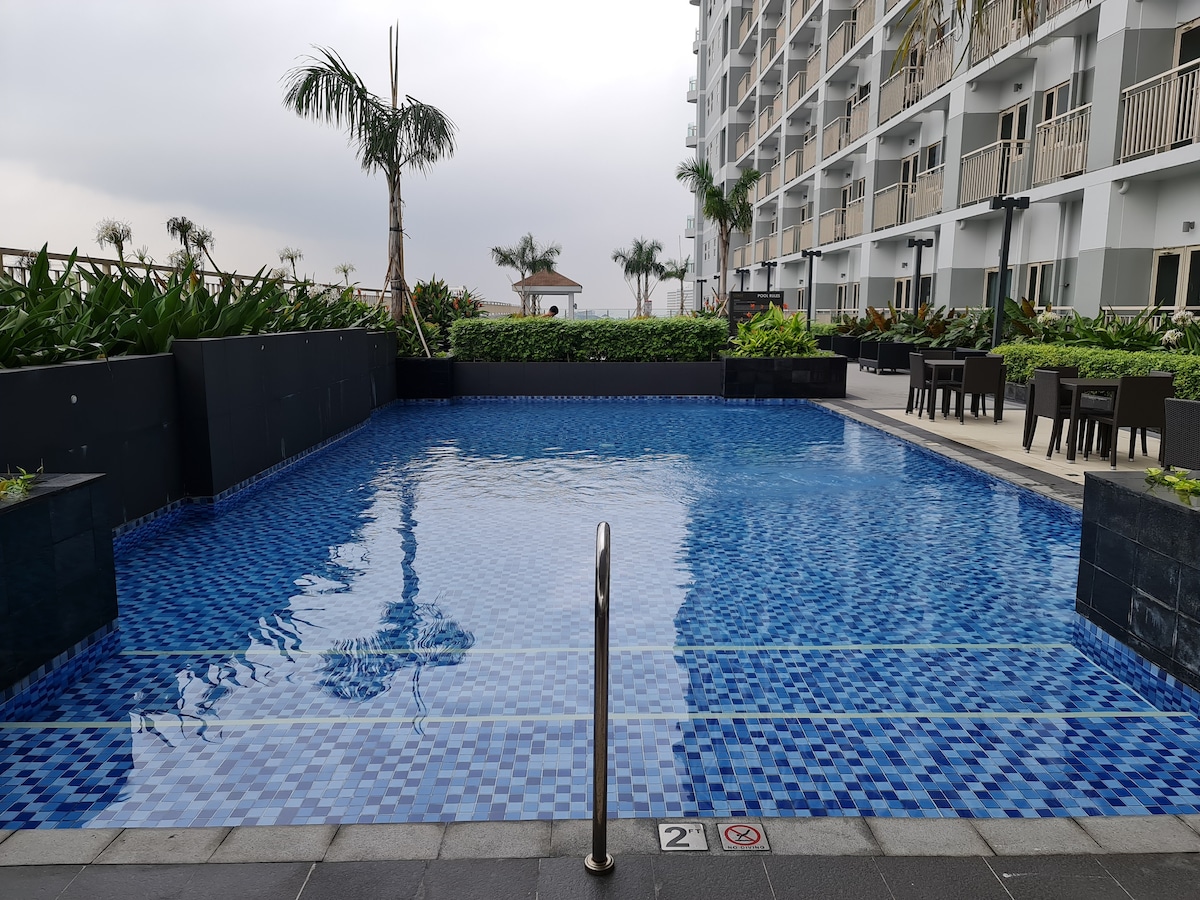 空港からわずか数キロ、マニラ湾エリアの数多くのアトラクションから徒歩圏内にある、バルコニーとプールを備えたモダンで広々とした1ベッドルーム。 設備の整ったキッチン、日当たりの良いリビングルーム、快適なベッド、Wi-Fi、Netflix、エアコン、テレビはリビングと寝室の両方にあります。 カップル、小さな家族連れ、出張者に最適な宿泊先です。 サウナとお子様用プレイエリアは無料でご利用いただけます。 プール- 3名様まで無料。それ以上のゲストは1名様P200。