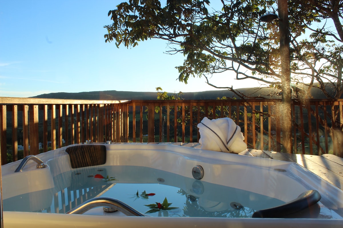 Chalé estilo rústico de arquitetura sustentável, construído com mão de obra local, utilizando madeiramento de reflorestamento e paredes de adobe , o que proporciona conforto térmico em um ambiente de charme. Deck com hidromassagem, piscina aquecida com borda infinita compartilhada, uma vista privilegiada e muito aconchego! veja também: airbnb.com/h/grutapousoalto * Café da manhã opcional pago à parte. obs: permitido fumar apenas na área externa