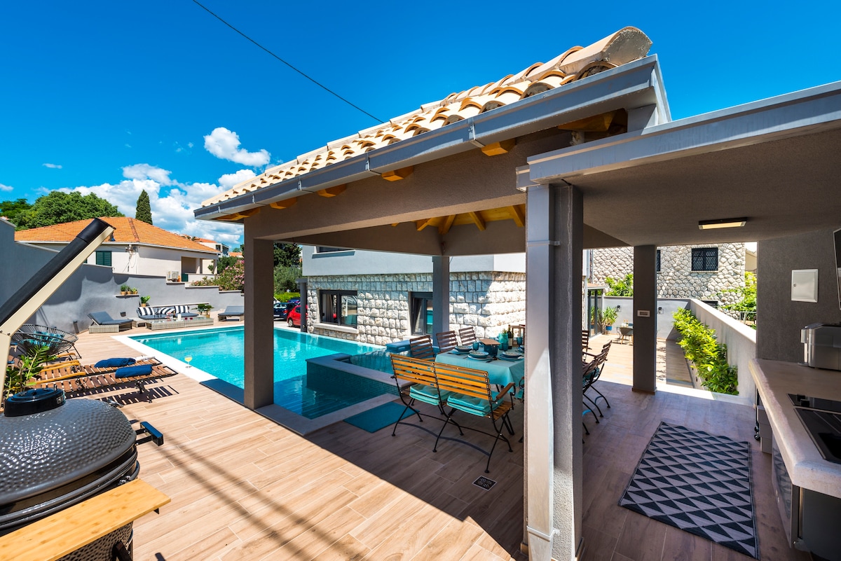 アドリア海を見渡す静かな隠れ家、Dubrovnik Heightsへようこそ ドゥブロヴニクの丘の上に位置するこのスタイリッシュなヴィラは、静かでプライベートな空間を提供し、アドリア海の壮大な景色を一望できます。プライベートプール、海を望む温水ジャグジー、専用のバドミントン用コートをお楽しみください。広々とした屋外エリアとモダンな快適さを備え、家族連れやグループに最適です。旧市街からわずか8 kmの場所にあり、地中海での休暇を楽しむのに最適な拠点です。心地よい秋の雰囲気と温かい海で泳ぐ時間が待っています!