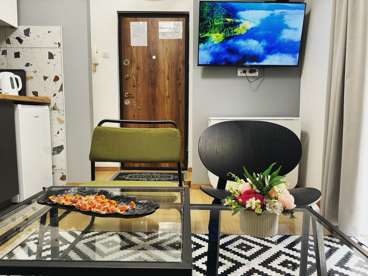 Quiet and cozy 1-bedroom apartment on the 3rd floor of a secure building with an elevator and surveillance cameras. Features a comfortable living room, fully equipped kitchen with dining area, bathroom, and a private balcony. Located in a quiet part of town, the apartment is still conveniently close to the city centre, shops, restaurants, and public transport. Whether you're visiting for work or a relaxing getaway, this apartment offers everything you need for a comfortable and enjoyable stay.