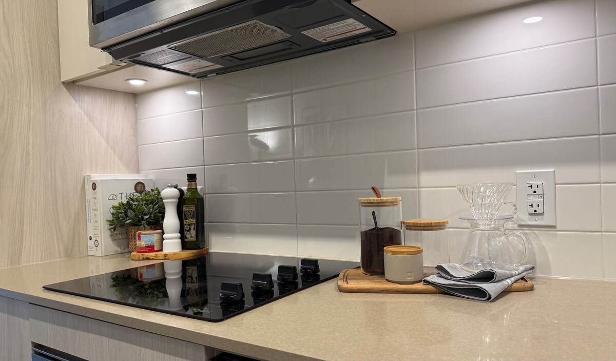 トロントのダウンタウン中心部にある、このモダンな1ベッドルームのコンドミニアムに滞在しましょう。CNタワー、ロジャース・センター、ウォーターフロントから徒歩圏内です。この宿泊施設は、寝室に快適なクイーンサイズベッド1台、リビングルームにソファベッド1台が備わっており、カップルや少人数のグループに最適です。床から天井までの窓からはスカイラインの景色をお楽しみいただけます。また、専用バルコニーでくつろぐこともできます。コンドミニアムには、フルキッチン、スマートテレビ、高速Wi-Fi、お部屋内の洗濯機と乾燥機が備わっています。ゲストは、ジムと屋外プールもご利用いただけます。