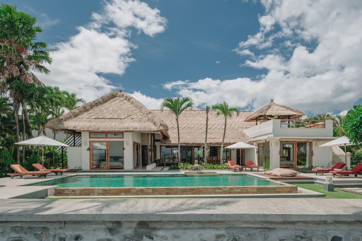 ヴィラノースバリへようこそ。最大10名様までご宿泊いただける美しいビーチフロントヴィラです。本物の茅葺き屋根のこの隠れ家には、5つの寝室、4つの専用バスルーム、そして素晴らしい14メートルのインフィニティプールがあります。料理人、ハウスキーピング、庭師、警備員などのフルサービススタッフが、屋内外を問わず、熱帯の生活をお楽しみいただけます。ご家族やご友人と一緒にバリ島での完璧な休暇をお過ごしいただくために、毎日の食事、マッサージ、日帰り旅行など、ヴィラのアップグレードを追加してください。