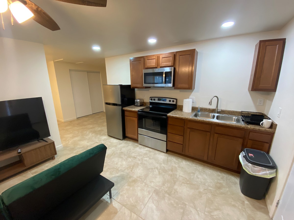 独立した玄関、浴室、パティオ、駐車場、キッチン付きの個室。清掃料金なし。ペット1匹の料金。 昼寝をする方にはおすすめしません。 小型犬が2匹います。アリゾナ大学から4マイル、I-10から6マイル、ツーソン国際空港から7マイルです。 車椅子でアクセス可能な16フィートx 12フィートの客室には、しっかりしたダブルベッド、ミニ冷蔵庫、トースターオーブン、電子レンジ、ホットプレート、フライパン、ディナーウェア、キューリグ、ブレンダー、ロールインシャワー、ADAトイレ、安全バー、傾斜入り口、カーポート/パティオ駐車場、外での喫煙が備わっています。