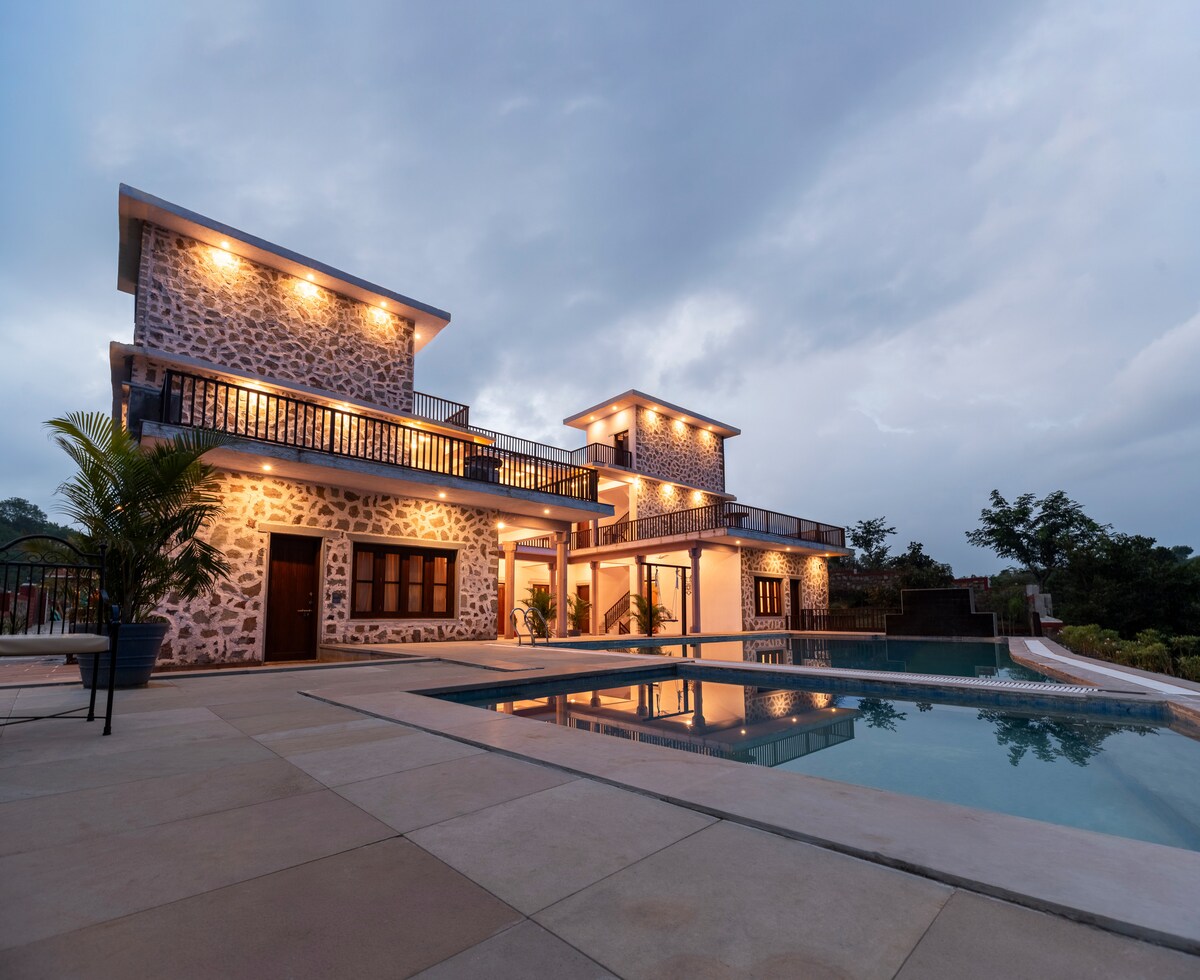 高級エアコン付きの客室3室 *モダンなインテリア* *館内ベジタリアンレストラン* *バスルームに大理石のバスタブ2台* *都会的な長方形のプール* *宿泊施設内のWi-Fi *パーソナルアテンダント(ご滞在中に必要なものがあれば)* *ペットOK *追加のマットレスあり* *駐車場 *シーリングシャワー *夜間のプール利用 *サンセットポイント *Bluetooth音楽システム *庭園 *焚き火エリア *調理エリア(IHコンロ付き) *エアコン付きダイニングホールとお部屋 *アラバリの丘の景色を望むプライベートヴィラ *クンバルガル砦から6 km