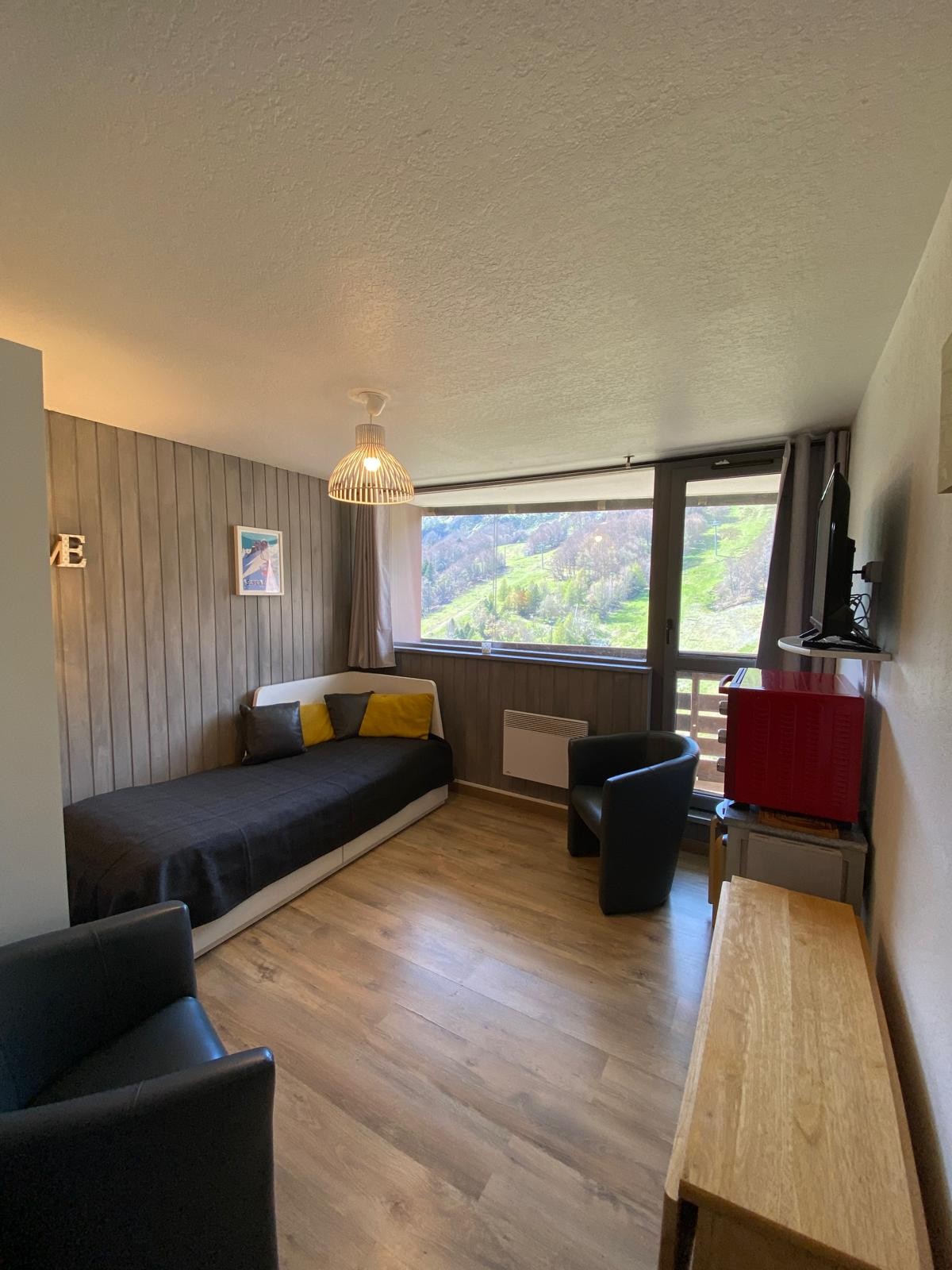 Studio meublé de 27 m2 avec vue imprenable, situé aux pieds des pistes de ski, avec local à skis en rdc. Il possède une kitchenette, salle d'eau-wc, 2 lits superposés dans une alcôve, séparée du séjour par une cloison, un lit 2P (140×190) dans le living et un balcon à Est, très belle vue sur le lac des hermines, la station et les montagnes. Séjour dans la semaine, arrivée 16h-départ 10h, en week-end autres horaires possibles.