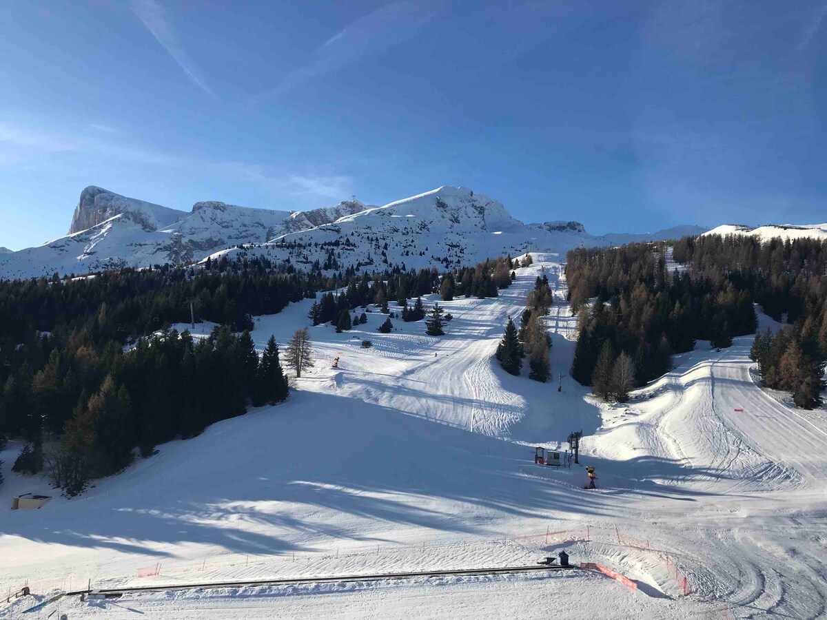 南アルプスの4階にあるスタジオで、エレベーターと南向きのゲレンデを望む、オールーズの木の建物にあり、スーパーマーケット、マウンテンバイクのレンタル、バー、レストラン、パン屋、ESFが1階にあり、スキー場の生活の場です。 ゲレンデ100km テニスコート、サッカー、バスケットボール、ペタンク、ツリークライミング、さらには、10分で行けるスパ、30分で行けるジャンプ湖(写真)があるスキー場 ベッド用のシーツはご用意しておりません (140 x 190のベッド2台と90 x 190のベッド1台)