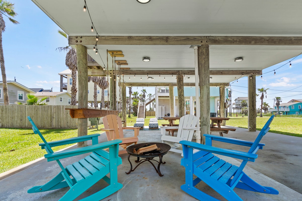 こんにちは!こちらの静かでおしゃれなビーチサイドの家で、のんびりとおくつろぎください。 コーヒーを片手にデッキに座り、海鳥のさえずりと穏やかな海の音に耳を傾けましょう。 1階でグリルを楽しみましょう。 コーンホールをしながらパティオで美味しいカクテルを楽しみましょう。 焚き火で甘いスモアを作りましょう。 ビーチまで1ブロック徒歩3 ~5分で行けます。交通量を避けたり、主要な通りを横切る必要はありません。 ガルベストン島の歴史と魅力をご満喫ください!