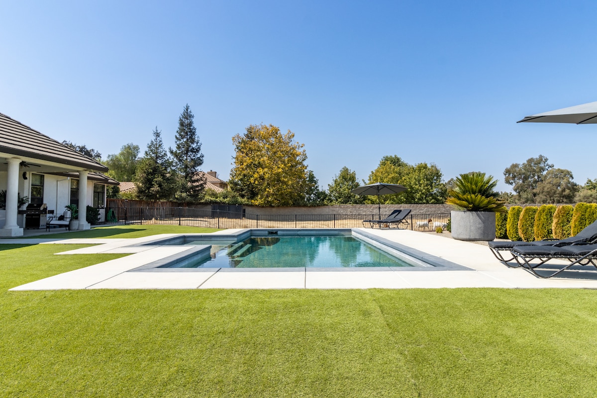 この家と敷地には素晴らしいものがたくさんあり、家族や友人が集まるのに最適な場所です。クルミ園に囲まれたオークの木々の景色を楽しむことができます。また、バーベキューとラウンジシートがある広いパティオをお楽しみいただけます。5つのスタイリッシュに装飾された寝室の1つでリラックスしたり、ゲームルームでビリヤードやチェスを楽しんだりできます。さらに、ファイルにある何百もの映画をお楽しみください。 すべてが18ホールの公共ゴルフコースの向かいにあります。
