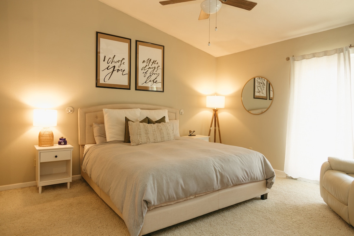 農家スタイルに完全に改装された家全体です。大人数グループや、単にプライバシーと広々とした場所を望む方に最適なオープンフロアです。 当宿泊施設では、長い1日の仕事や遊びの後に快適に休息できるよう、クイーンベッド5台とメモリーフォームマットレス、フルバスルーム2室、スマートナイトランプ(携帯電話の充電機能付き)を提供しています。 洗濯機と乾燥機は中にあります。 ワークデスク。屋外ダイニングテーブル、バーベキューグリル、リラックスできるパティオセット。 働く方や家族旅行に最適です。