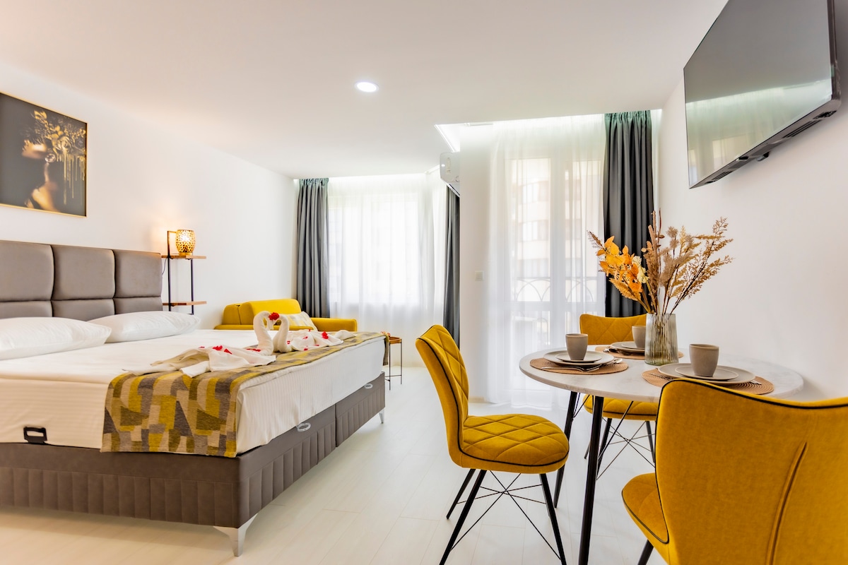 WINTER SPECIAL – 28+ nights for ~590 €/month “all-in” (incl. Airbnb fee, heating, Wi-Fi, electricity & water). Ideal for remote work & long stays. Warm, quiet apartment in Harmony Suites Grand Resort with fast Wi-Fi, a work desk, heating and a fully equipped kitchen. 600 m from the beach, close to Nessebar. Perfect for 2–12 week winter stays, study trips or working remotely by the sea.