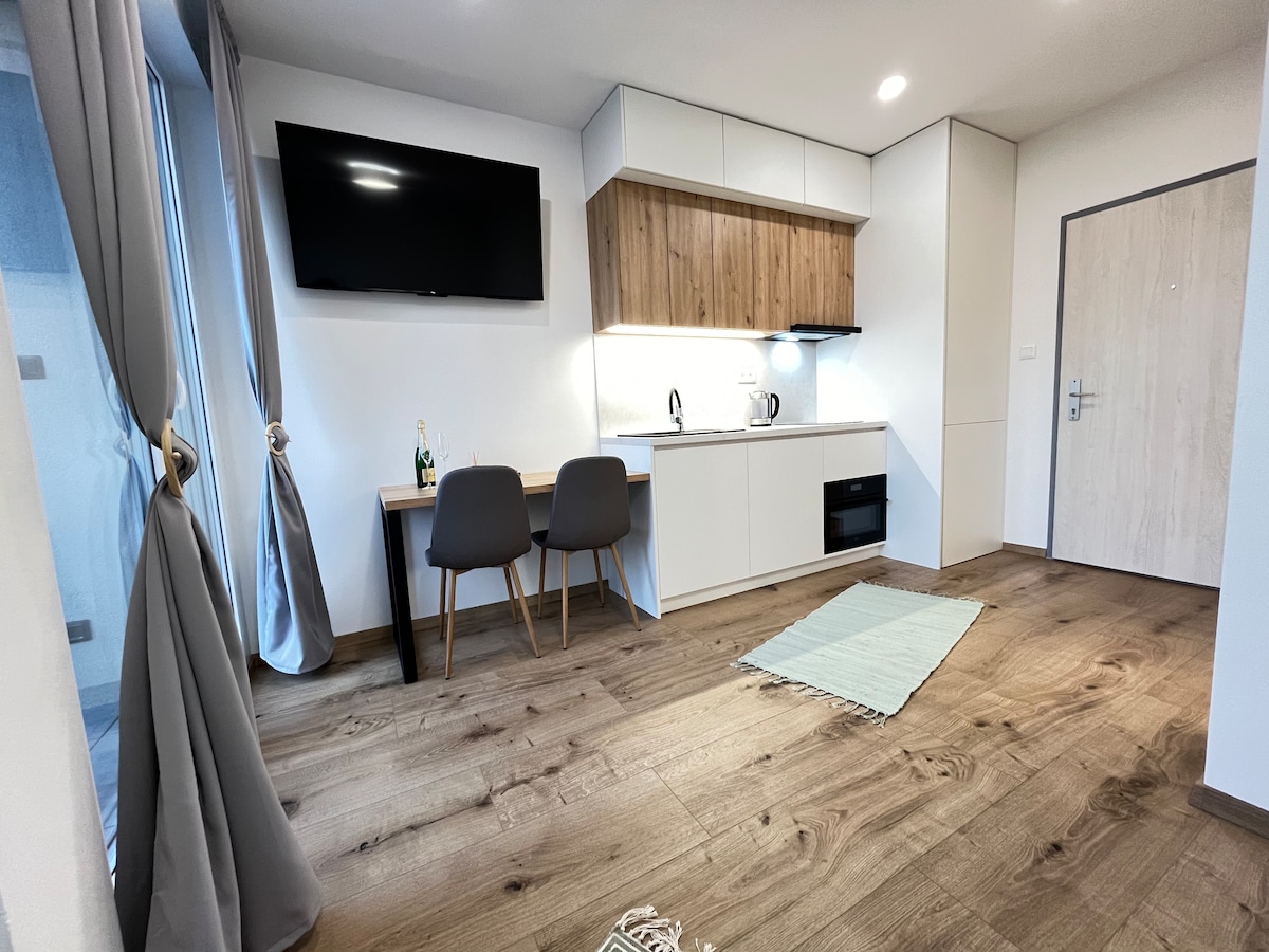 西タトラ山脈の美しい景色を望む、屋根窓のバルコニー付き33平方メートルのシェルターハウススタジオ。広々とした4メートルのインテリアは、マツの木で仕上げられています。180x200cmの「キングサイズ」ベッドは、2つのシングルベッドに分けることができます。食器洗い機、冷蔵庫、電子レンジ、トースター、コーヒーメーカーを備えたキッチン。100cm幅の折りたたみ式ソファチェアにより、2人または子供連れの2人でも快適に過ごせます。オープンスペースのバスタブ、別室の洗面台付きトイレ。