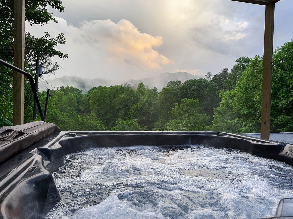 オープンしました!朝のコーヒーを片手にロッカーチェアに座ったり、キッチンのテーブルで食事をしたり、暖炉の前に座ったりして、素晴らしい景色をお楽しみください! 湯船は美しいマウンテンビューを見下ろすデッキにあります。 ブライソンシティとナンタハラアウトドアセンターからわずか20分、ツァリレクリエーションから10分、スモーキーマウンテン国立公園、チェロキー、ブルーリッジパークウェイから25分です。 キャビンには他のおすすめも書いてある本があります
