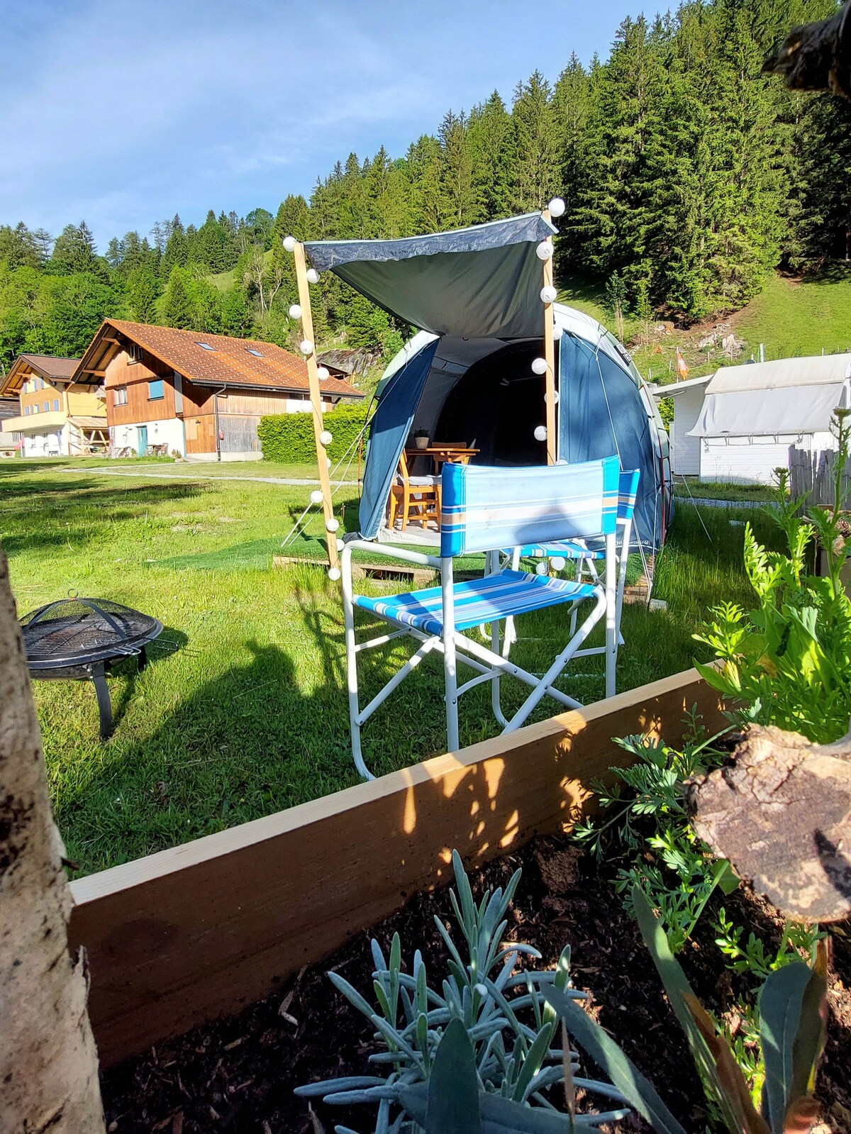 Erlebe Komfort und Natur. Unser Glamping-Zelt auf dem Campingplatz Bergblick in Adelboden bietet eine einzigartige Übernachtungsmöglichkeit für zwei Personen. Es ist gemütlich eingerichtet mit zwei Einzelbetten und verfügt über Elektrizität und Sitzgelegenheiten.