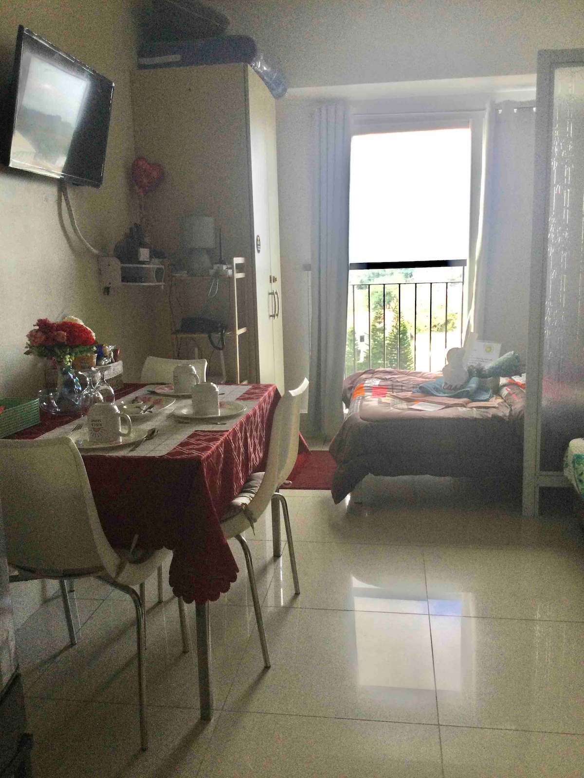 Elmoさんのタガイタイのステイケーションは まるで自宅にいるかのような快適さをお届けします。 訪れたい場所の近くにある高級な宿泊先に滞在しましょう。美しいコンドミニアムユニット セミダブルベッド2台と、温水プールを見下ろす専用バルコニー、簡単な調理ができる専用キッチンを備えた広々とした40平方メートルのユニット。すべての調理器具が揃っています コレルの食器4人分が揃っています。 シャワールームには、洗面台と同様に、快適にご利用いただけるよう、温水と冷水が備わっています。