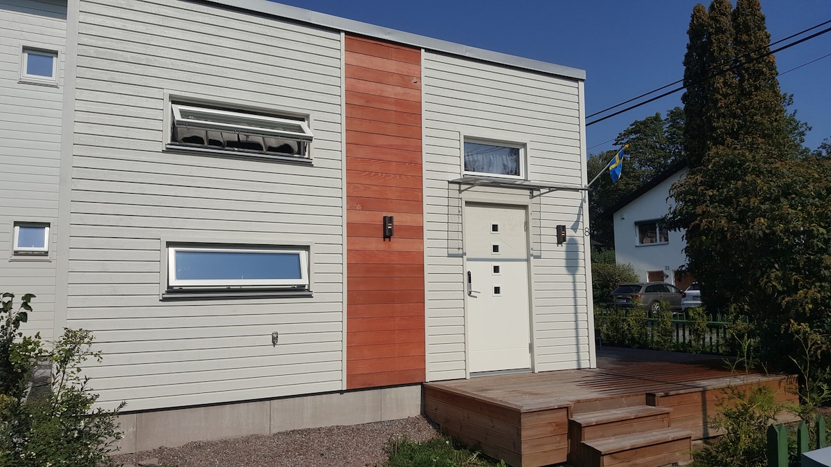 This small house is peacefully and centrally located near Stockholm C. The cottage is newly built with kitchen(dishwasher), living room, bedroom, bathroom(washing machine). It takes a few min. to walk to the subway Mörby C. and it takes 15 min. by subway to Stockholm C, 10 min to University. The cottage is very child-friendly with a playground and no car traffic. In the loft there are 2 beds (90x200, new, comfortable). If you are more than 2 adults, someone must sleep in the loft. Inconvenient?